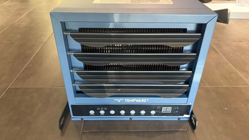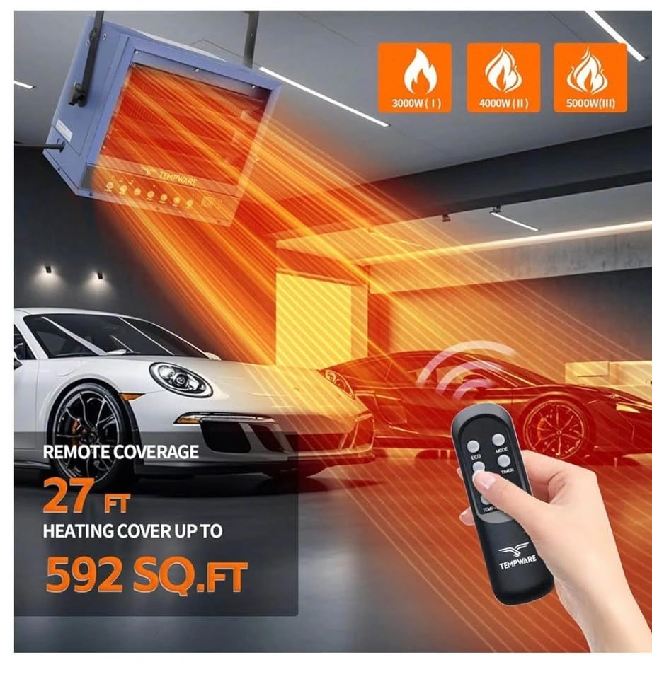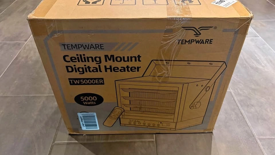 New Tempware ceiling mount digital heater with 5000 watts of power. Features digital controls with timer, temperature settings, and an ECO mode. Remote control included. Hardwired install