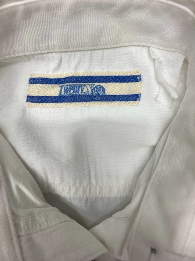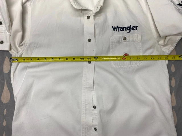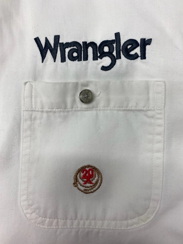 New condition from pet free, smoke free home. Wrangler 20X white cotton button up shirt with wrangler stitched down the left sleeve as well as over the pocket. NSPU. Holds with e-transfer only.