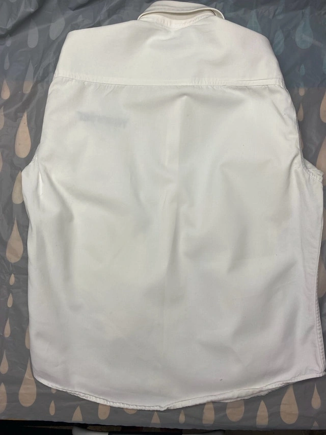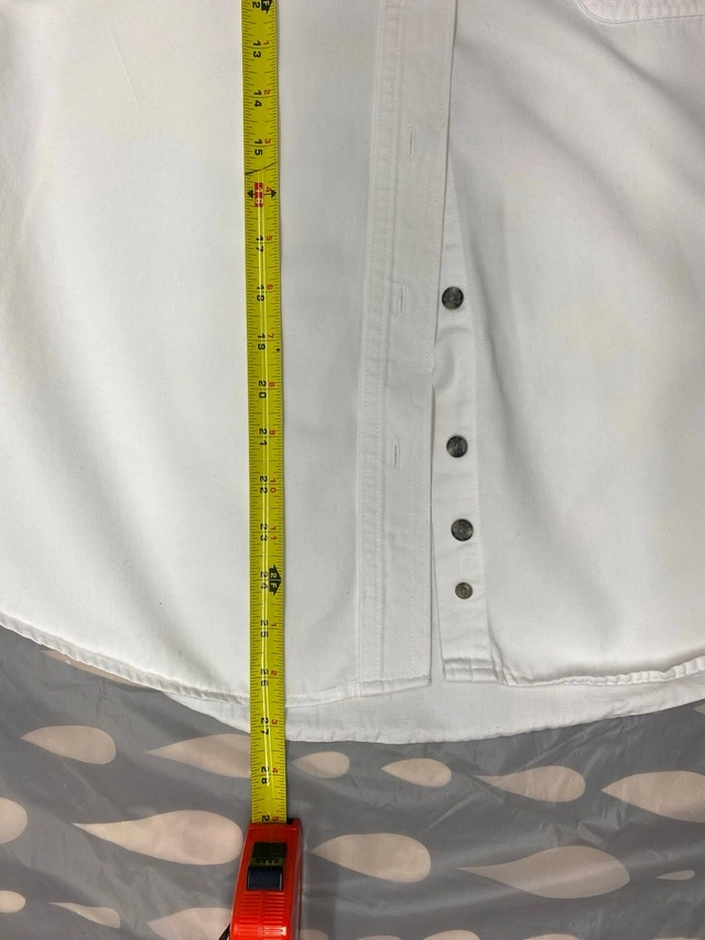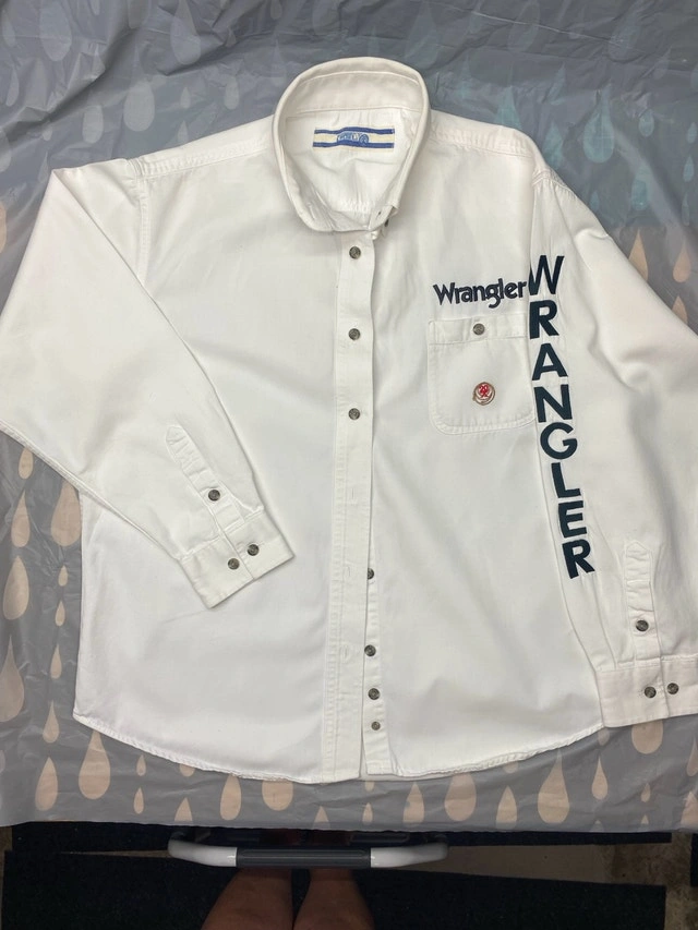 New condition from pet free, smoke free home. Wrangler 20X white cotton button up shirt with wrangler stitched down the left sleeve as well as over the pocket. NSPU. Holds with e-transfer only.