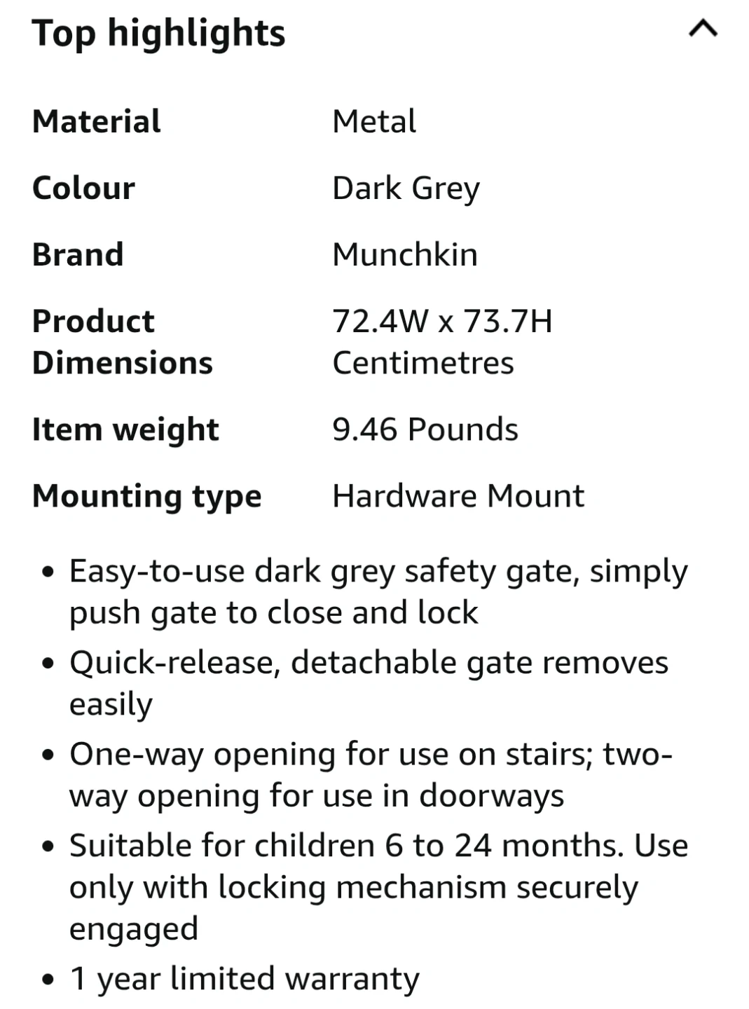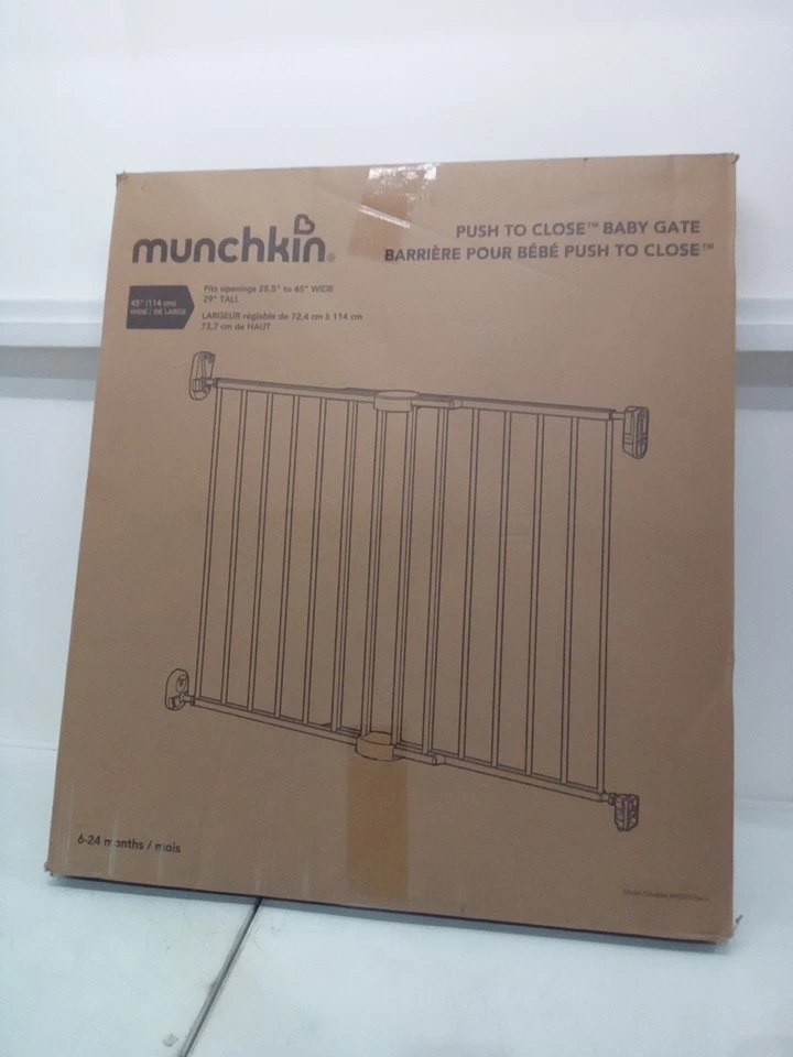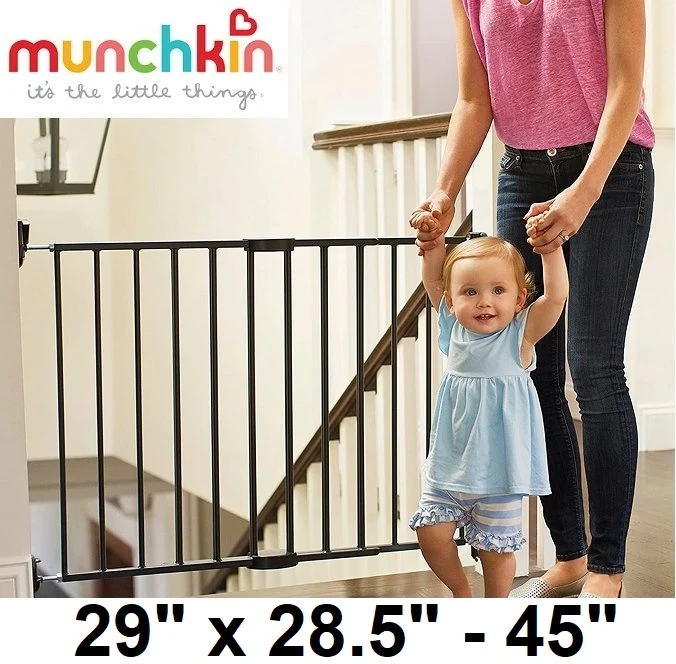 I'm selling a new Munchkin baby gate, perfect for keeping your little ones safe! This hardware-mounted safety gate is dark grey, made of metal, and extends from 28.5 inches to 45 inches wide. It's designed for stairs, hallways, and doorways, providing a secure barrier for children aged 6 to 24 months.