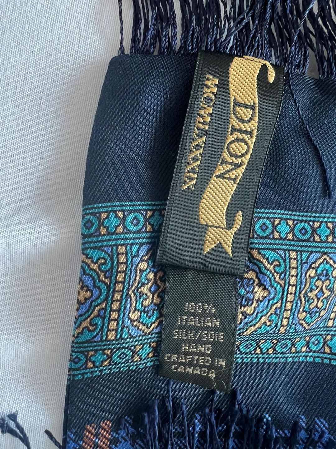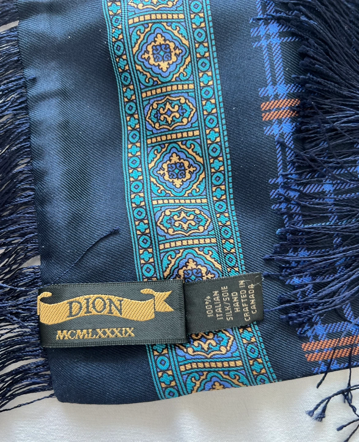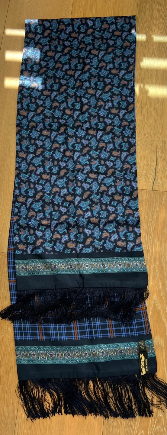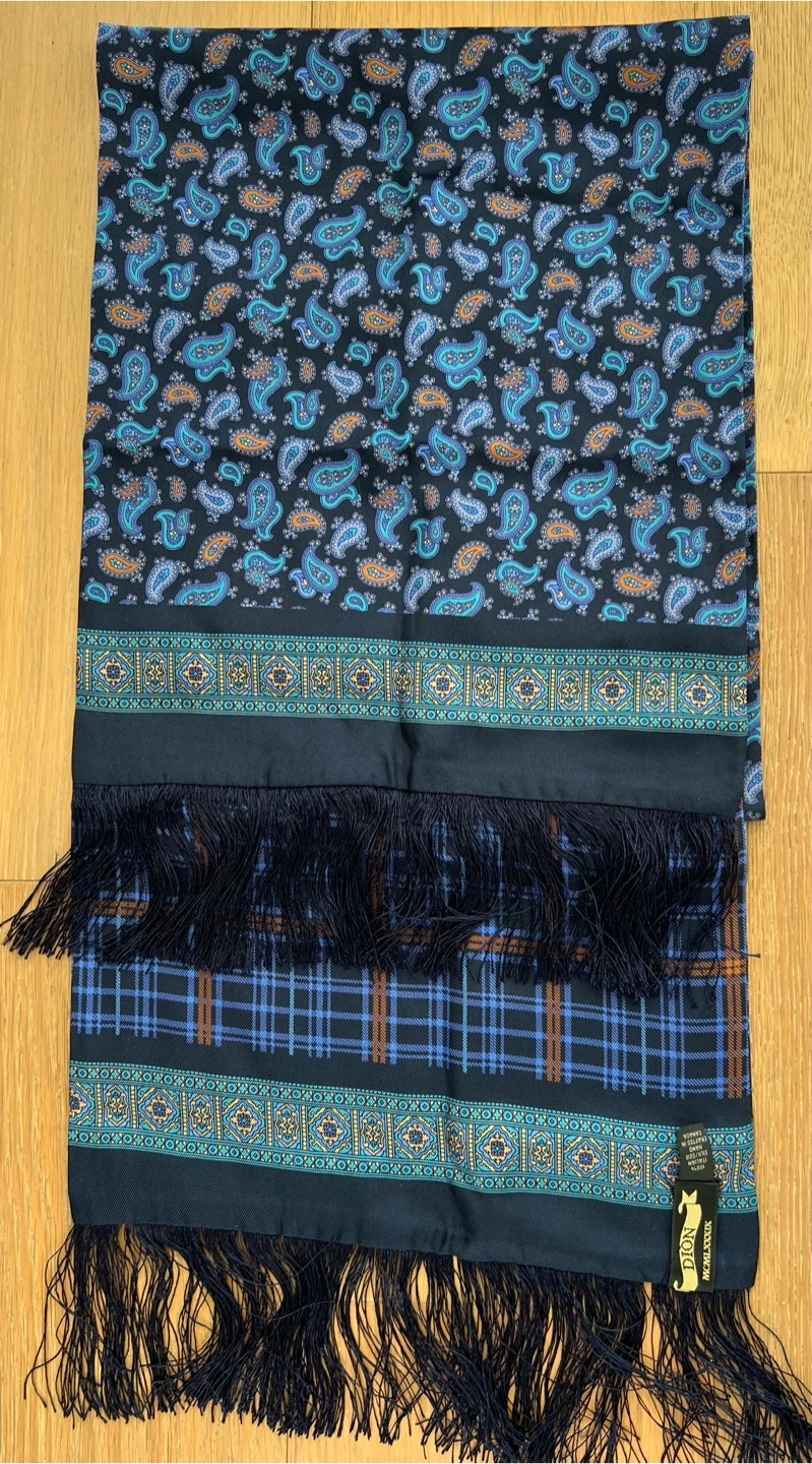 A touch of elegance to your wardrobe with this striking Dion scarf, crafted from 100% Italian silk and handmade in Canada. This new, never worn scarf features a sophisticated paisley and plaid design with stylish fringes, making it a versatile accessory for any occasion. Never been worn!!