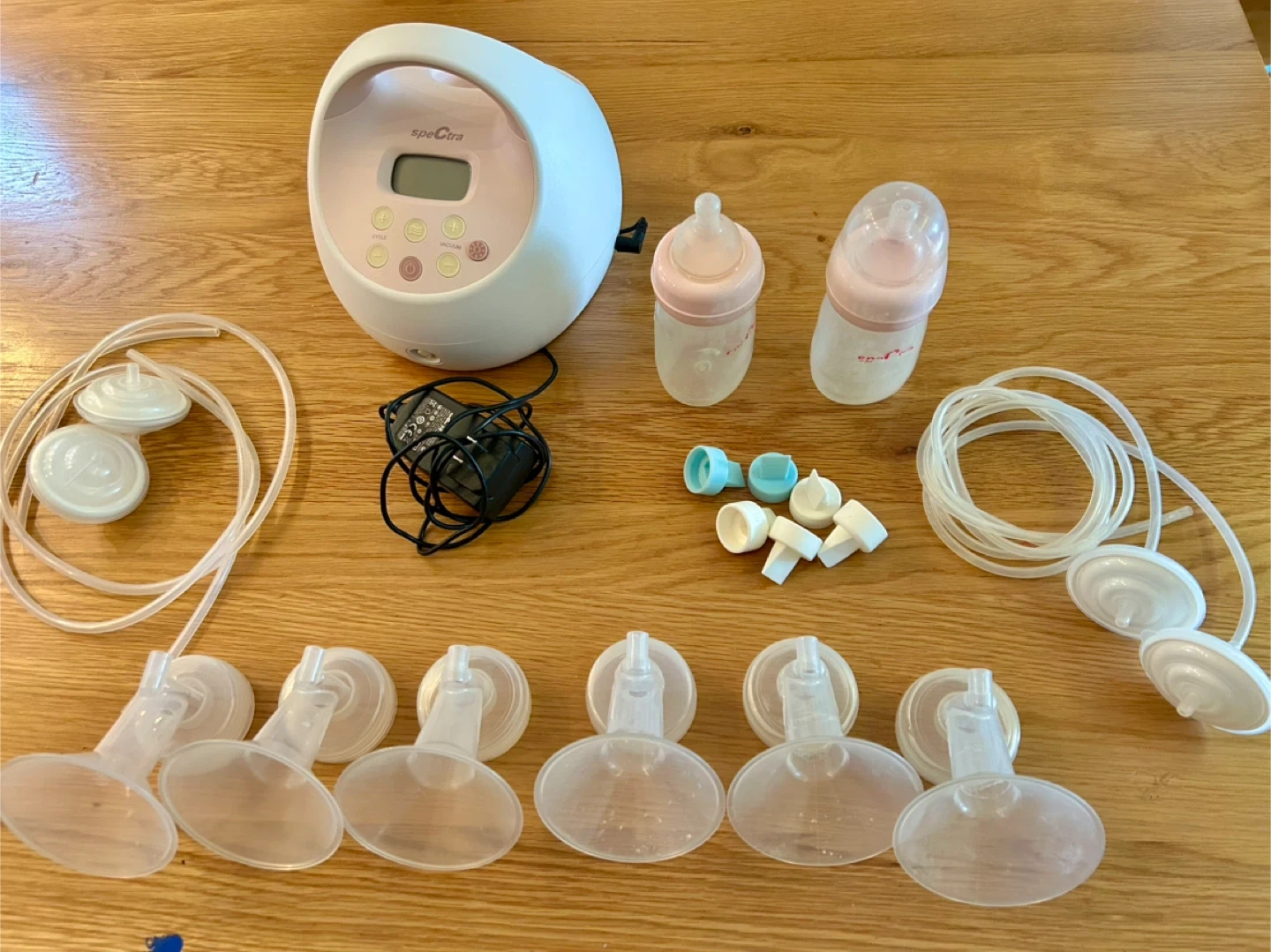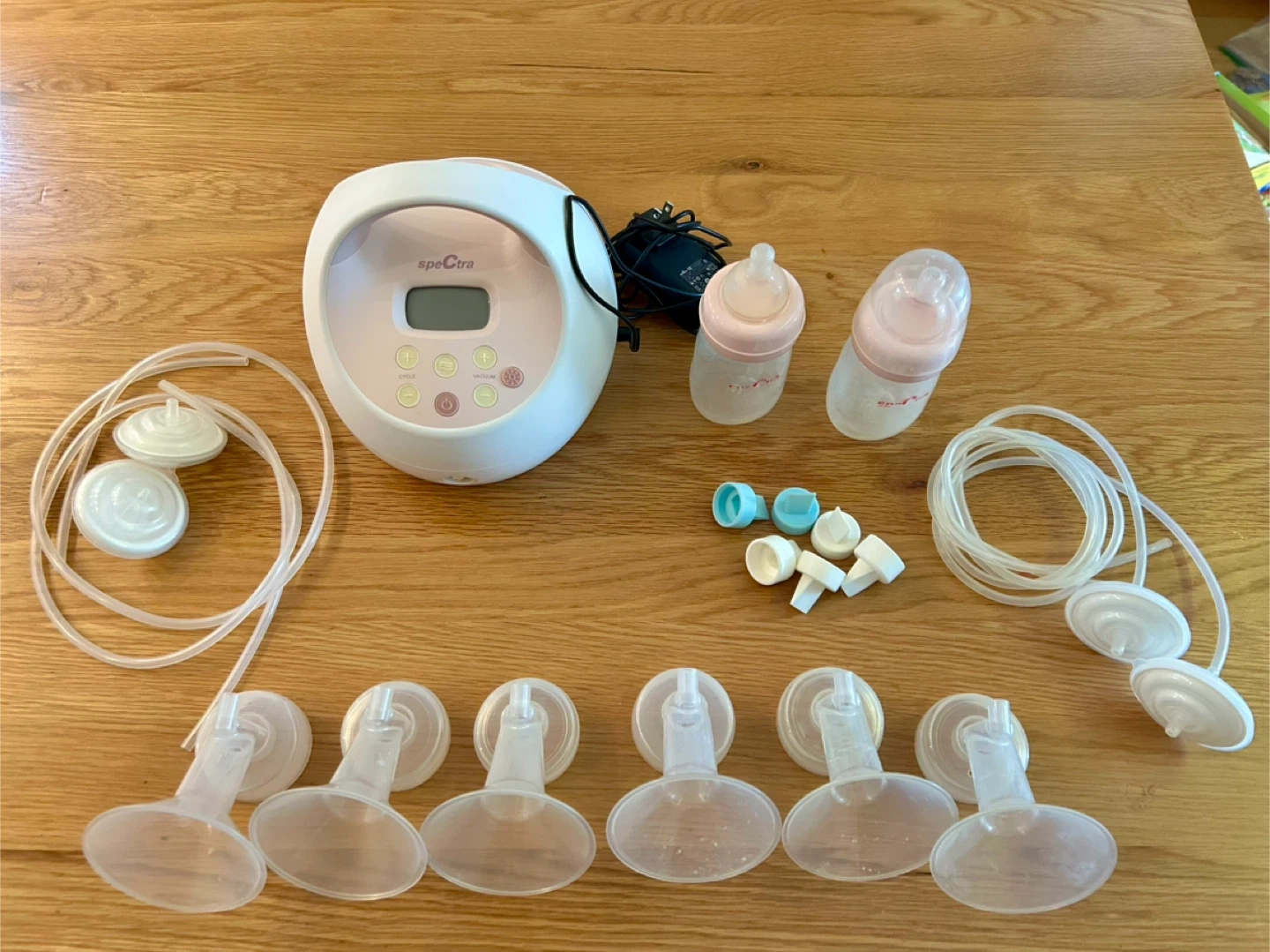 Spectra S2 Plus electric hospital grade breast pump. Includes pump, power cord, two bottles, two sets of tubing, and three flange sizes. Works great!