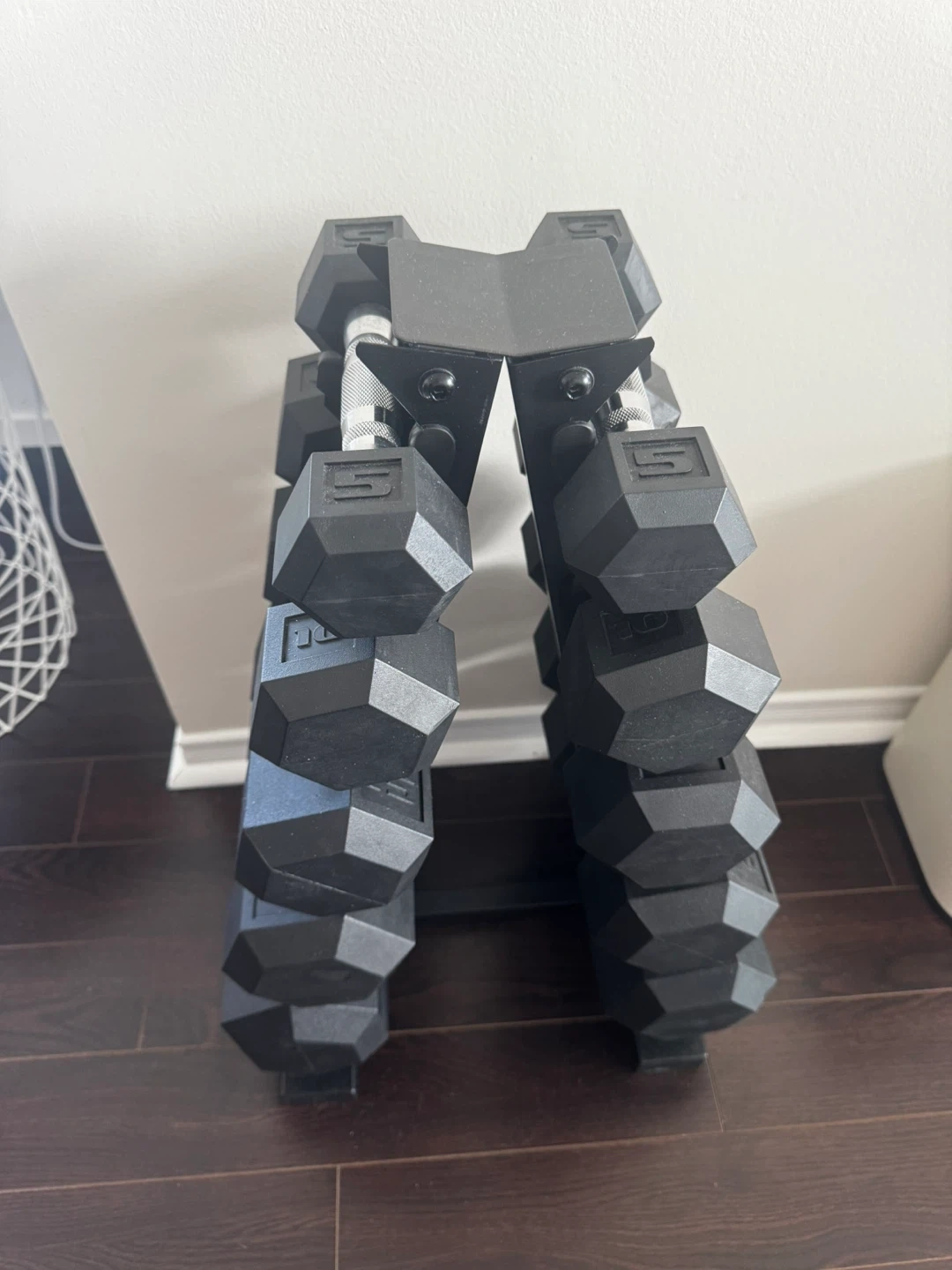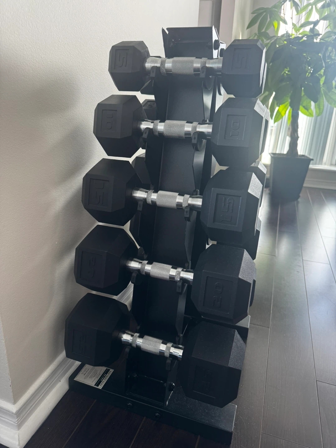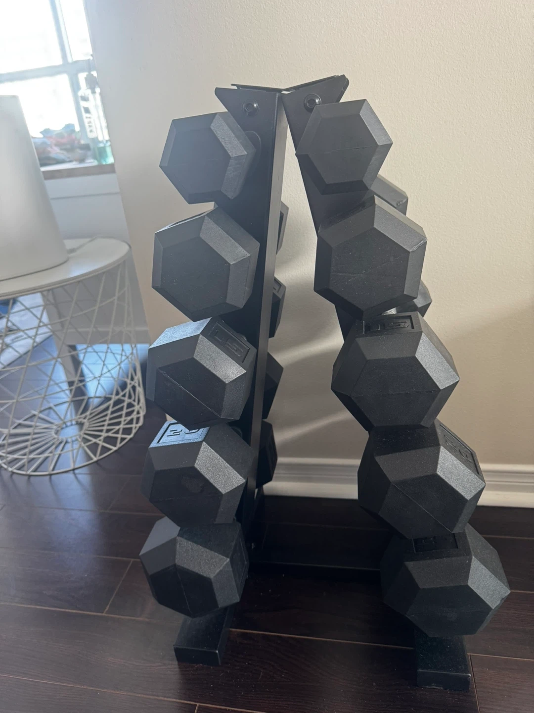 This is a set of hex dumbbells on a rack. Dumbbells range from 5 lbs to 20 lbs. They have comfortable rubber grips. Great for home workouts!