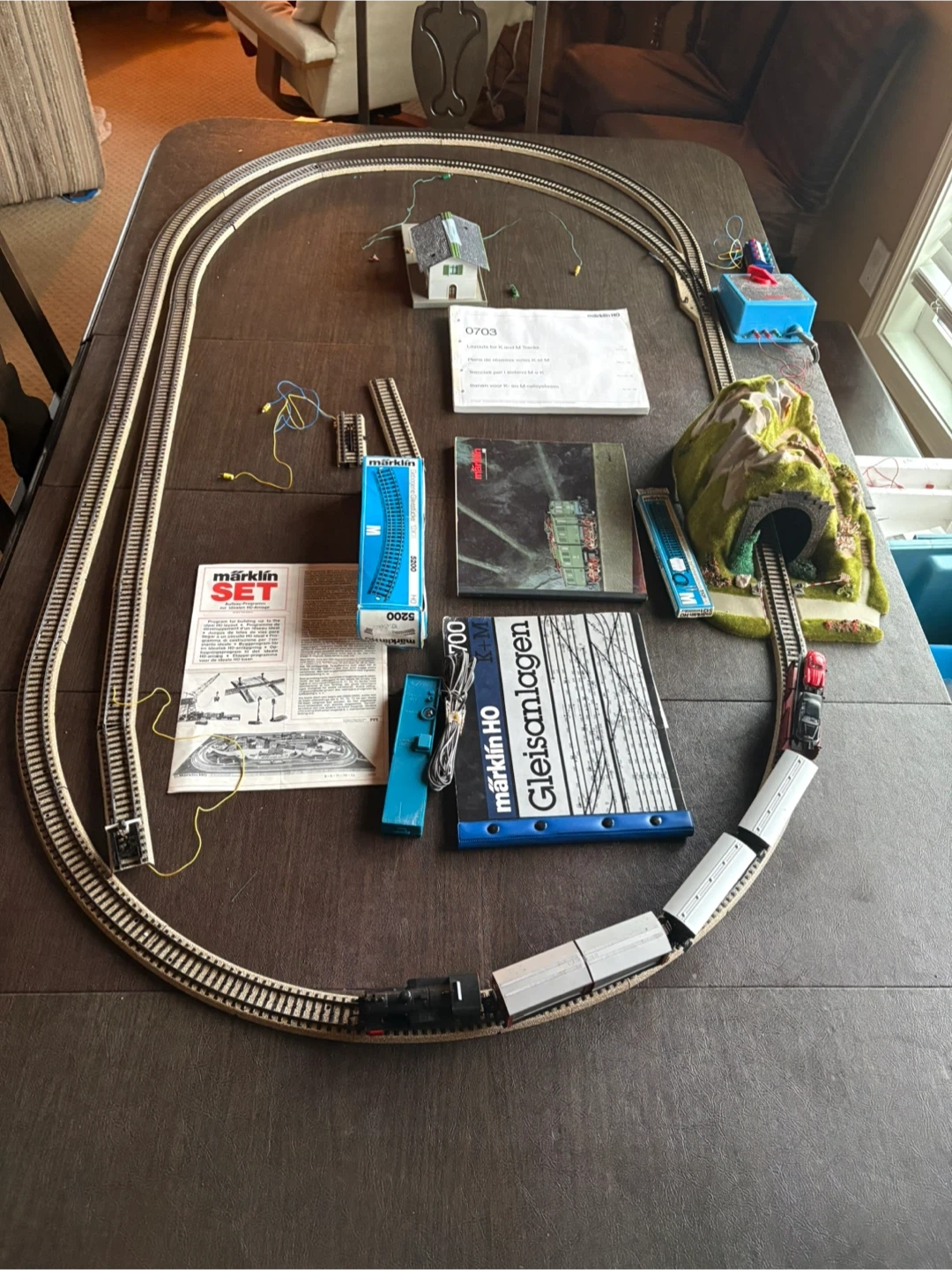 This is a Märklin HO scale model train set with track, a tunnel, a house, and accessories. It includes various track pieces and a blue control box. Instructions and some original packaging are also included. It's a great set for model train enthusiasts!