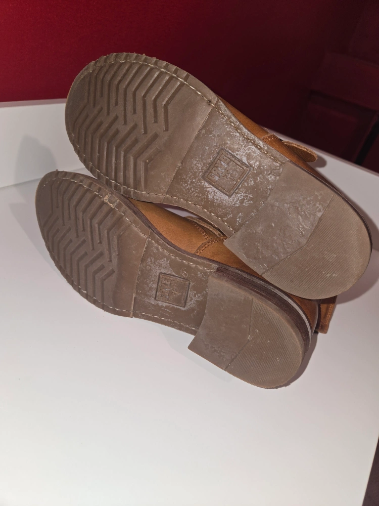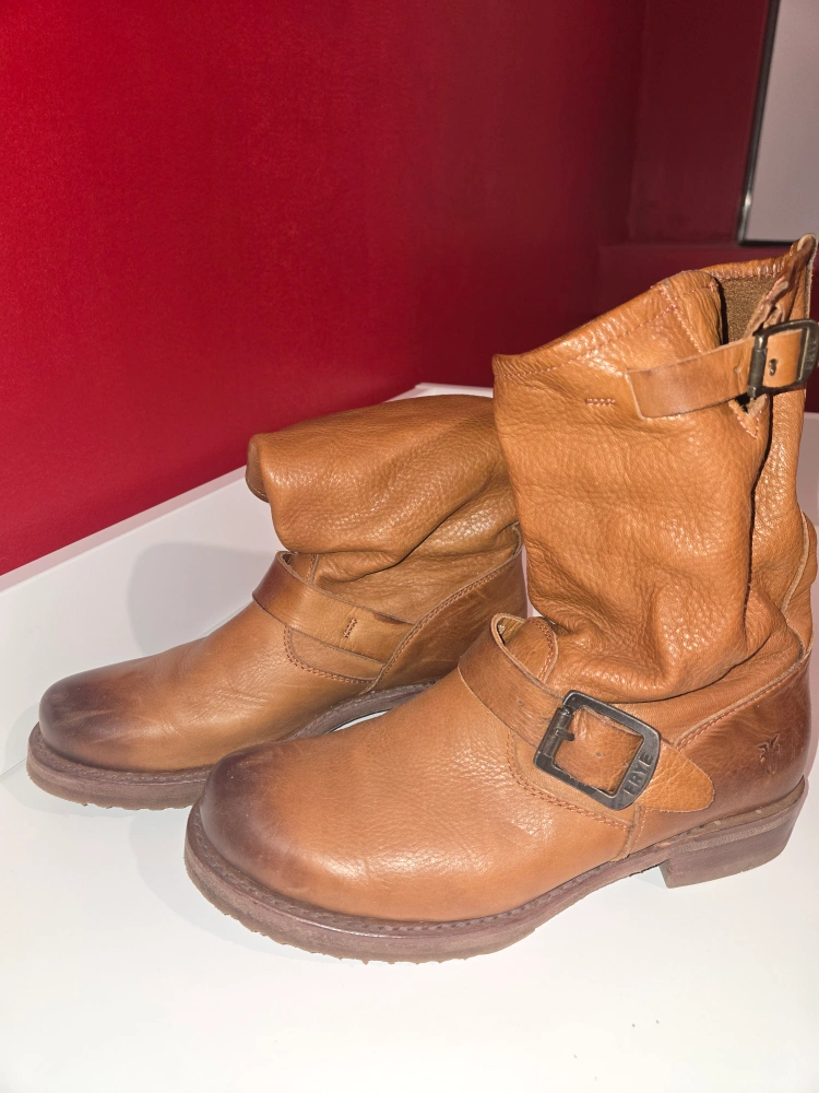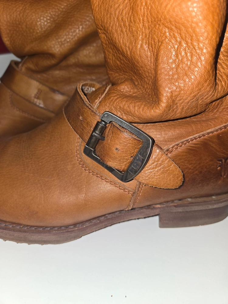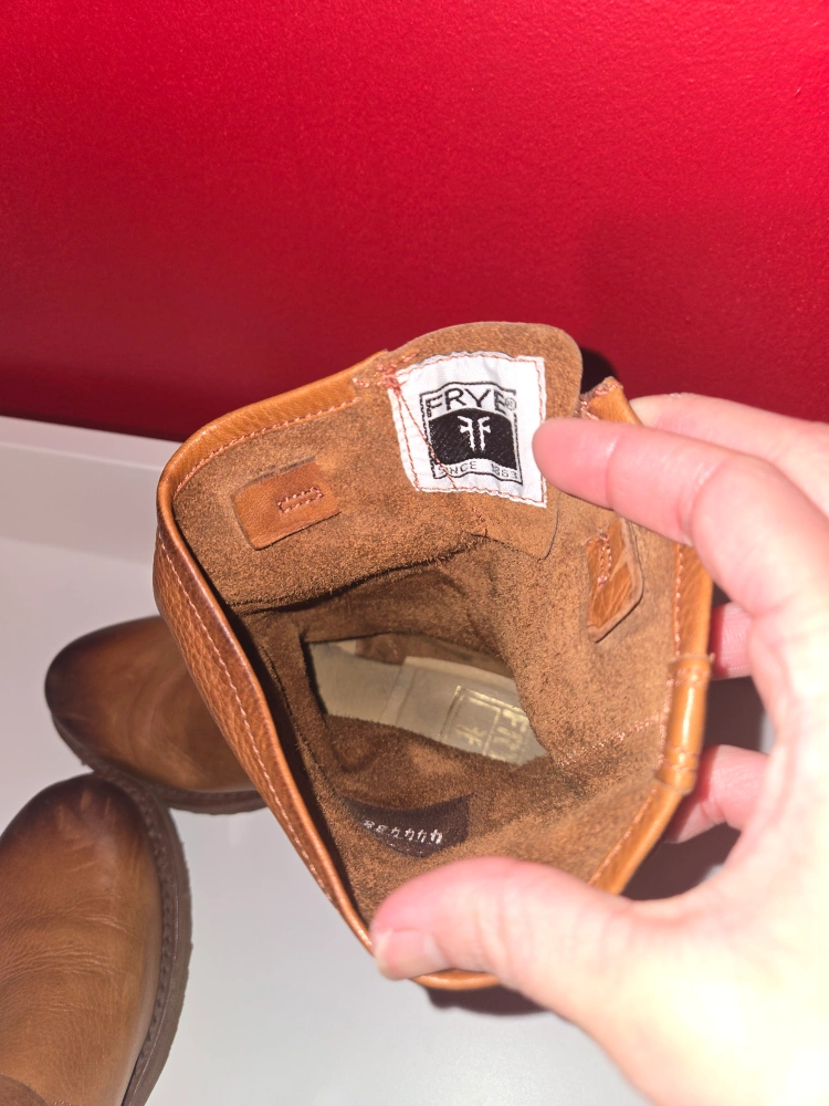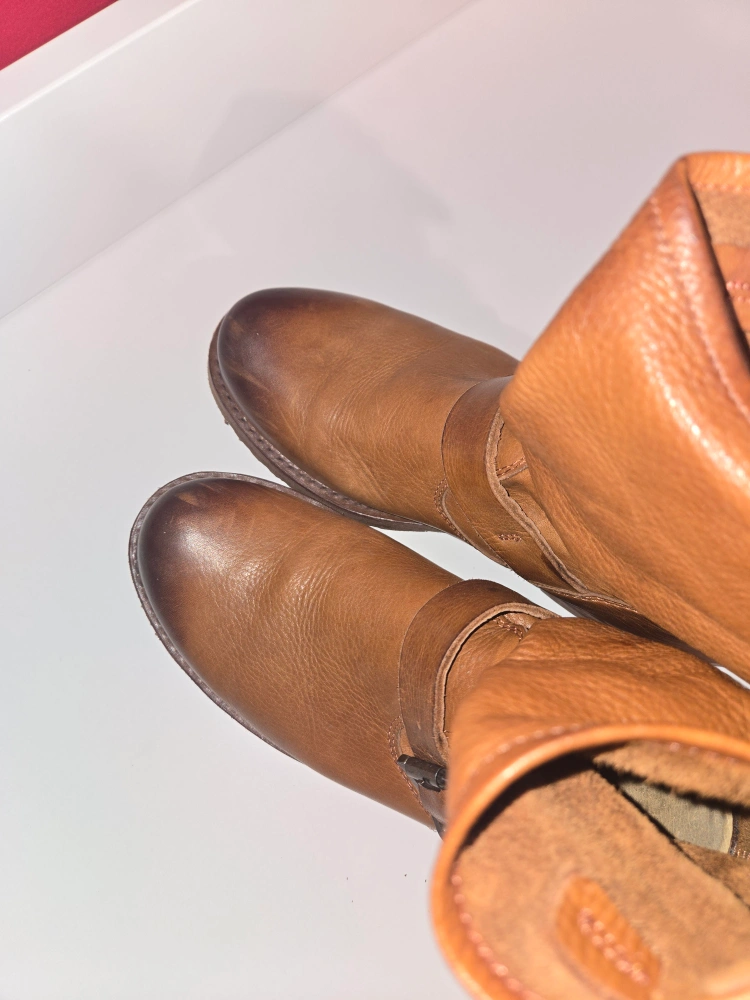 140Beautiful whiskey bown leather boots in terrific condition, perfect for Fall!. Fell in love with them, but alas, my feet are a bit too wide. Leather top made to slouch gives a relaxed fit around the ankles.
