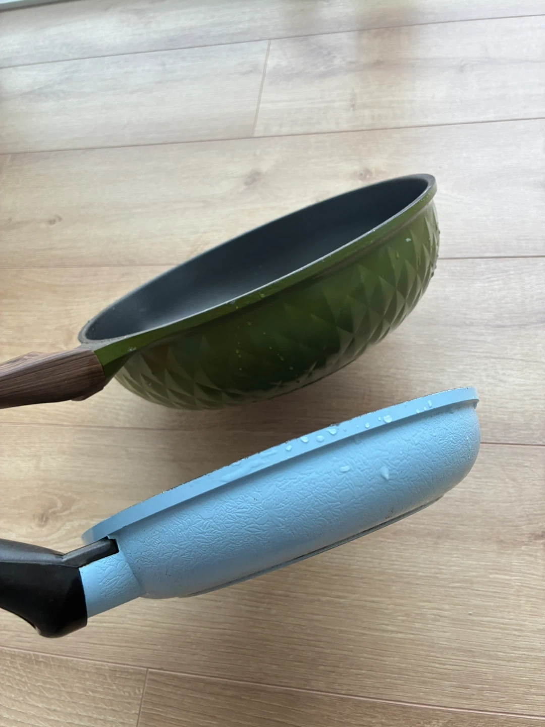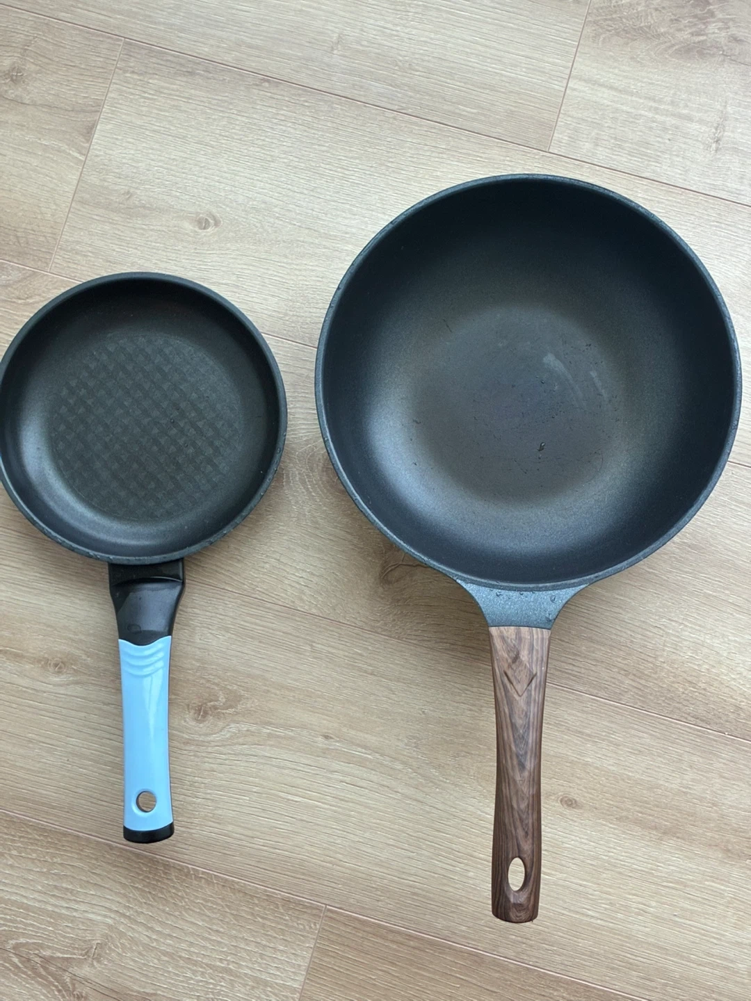 Selling a set of two pans! One is a frying pan with a light blue handle, and the other is a wok with a wooden handle. They're both in good condition and ready for a new kitchen