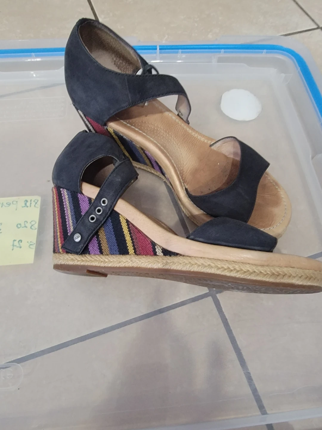 Black suede wedge sandals with a colourful striped espadrille wedge heel. They feature adjustable ankle straps and a comfortable cushioned footbed. Perfect for adding a touch of flair to summer outfits!