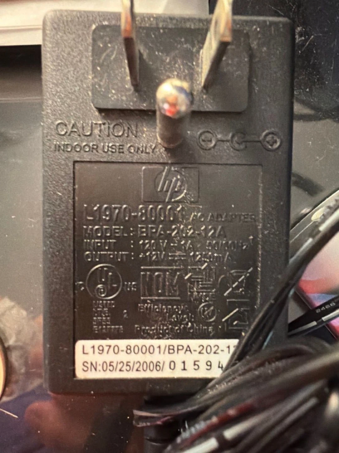 HP 12V AC adapter – original HP wall‑plug power supply (Model BPA‑202‑12A, part L1970‑80001) with 120V input and 12V DC 1250mA output, often used for small HP peripherals and docks.
