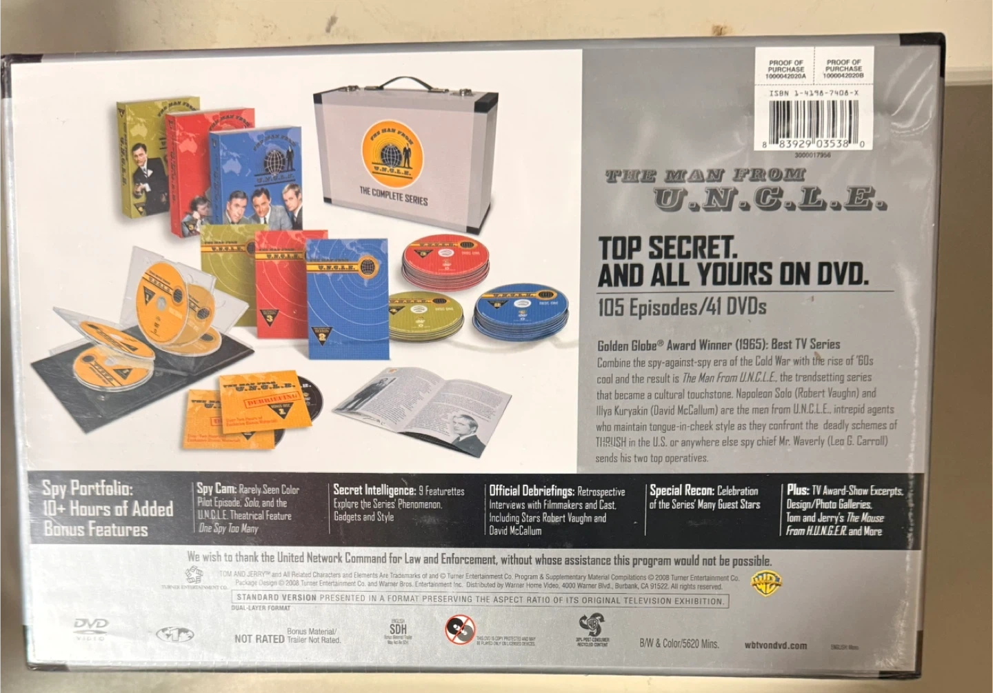 This is the complete series of The Man From U.N.C.L.E. on DVD. It includes all 4 seasons, totaling 105 episodes on 41 discs. Over 10 hours of special features are also included, plus the original colour pilot. This set is presented in a briefcase-style case with a handle and clasps.