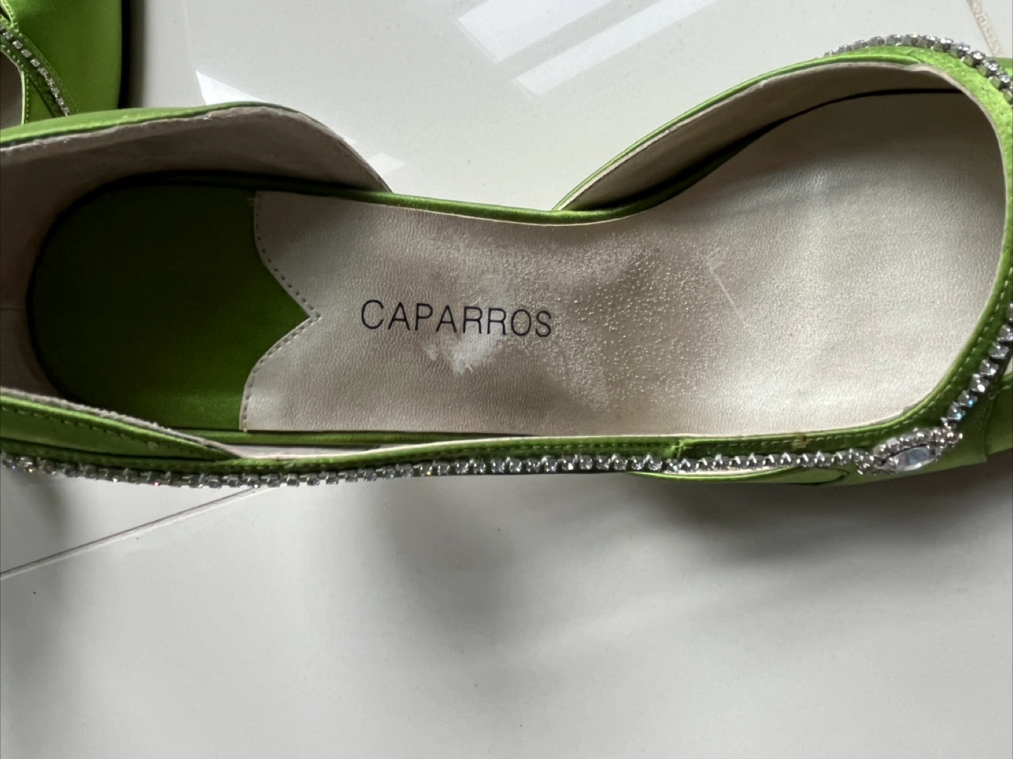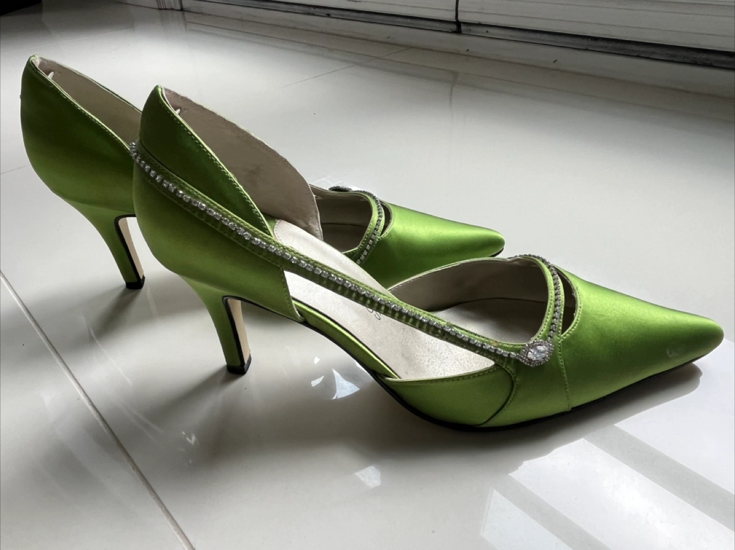 Man made leather sole and satin upper. They feature a dazzling rhinestone trim along the cut-out sides. The vibrant green colour makes them a fun choice for a night out! Comes with original box. Worn once for an event. Pick up only between Tuesdays through Thursdays.