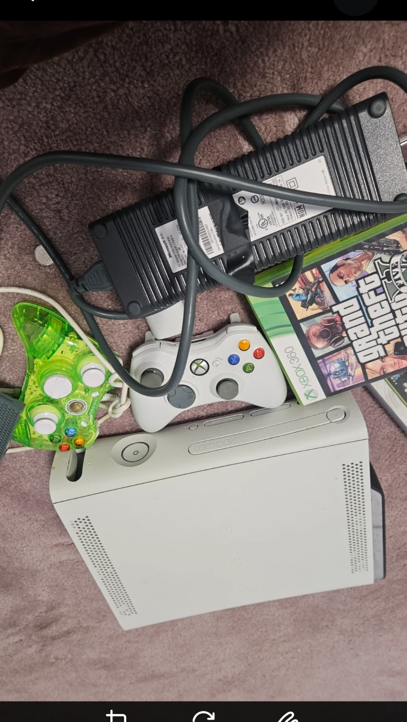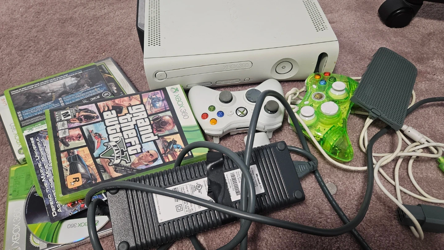 Selling an Xbox 360 console with a few games and accessories! It comes with the power adapter and two controllers. The games included are Grand Theft Auto V, Battlefield 3, Need for Speed Hot Pursuit, Lego Star Wars The Complete Saga, and FIFA 18. Perfect for some retro gaming fun!