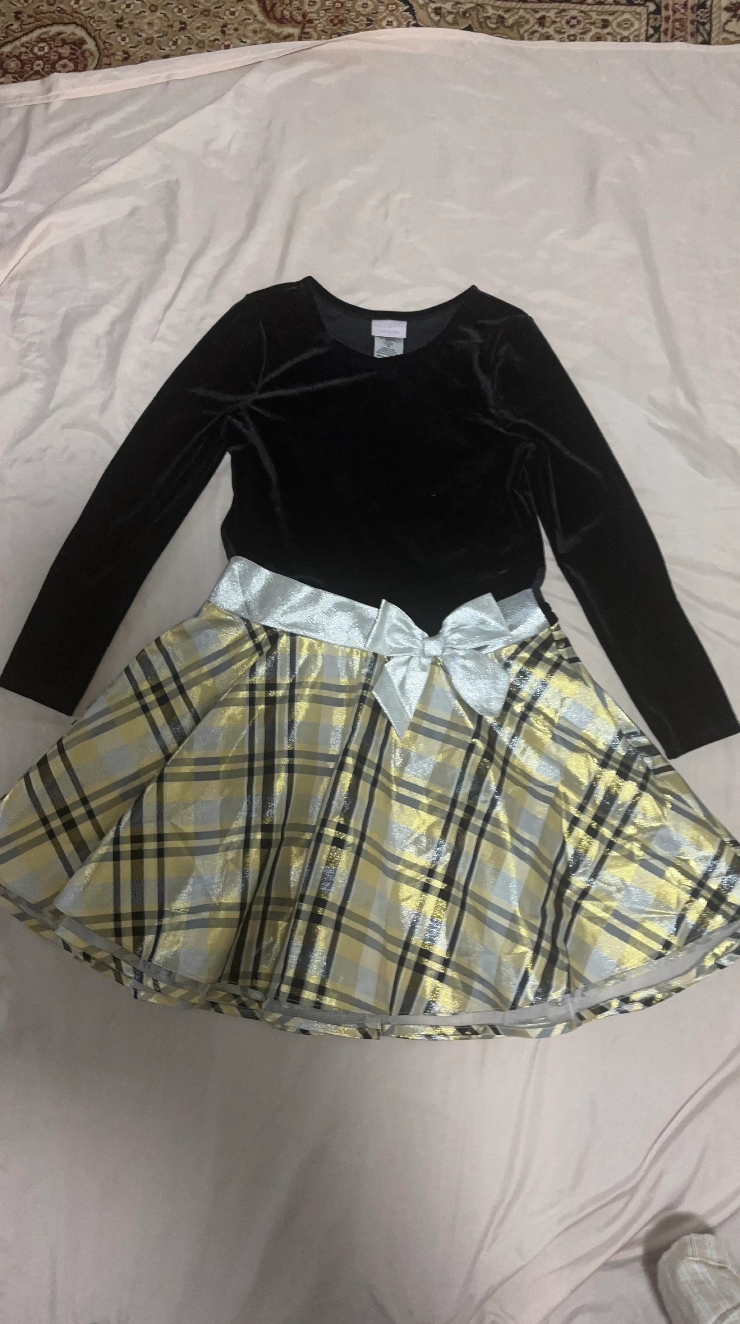 This is a cute girls' dress with a black velvet long-sleeved top and a plaid skirt. It features a silver bow at the waist. This dress is perfect for special occasions or holidays!