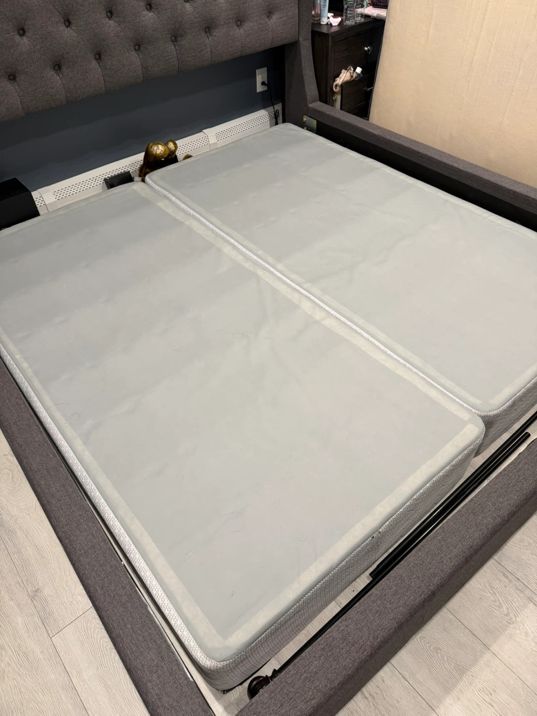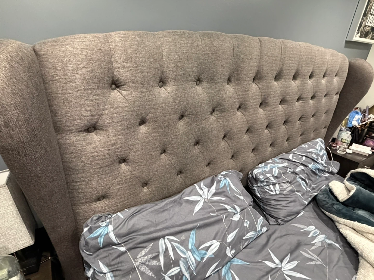 Tufted wingback upholstered bed frame (king size ) Comes in a neutral grey fabric. Includes headboard ,footboardand spring board.