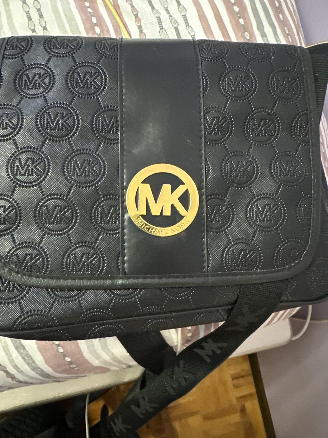 Michael Kors shoulder bag in black with all-over MK monogram pattern. It features a gold-tone MK logo on the front flap. The strap also has the MK logo repeated.