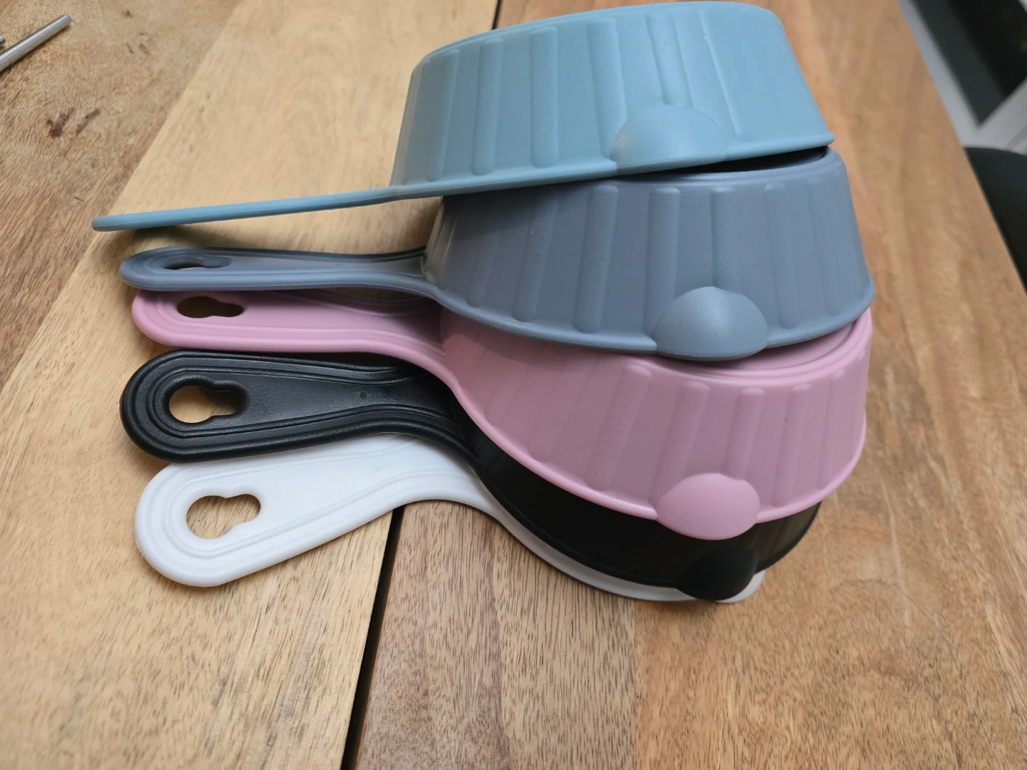 Here's a set of five plastic scoops, perfect for scooping ingredients or serving small portions. Made in Korea from PP plastic, they're dishwasher safe and can handle freezing temperatures. The set includes one white, one black, one pink, one blue, and one grey scoop.