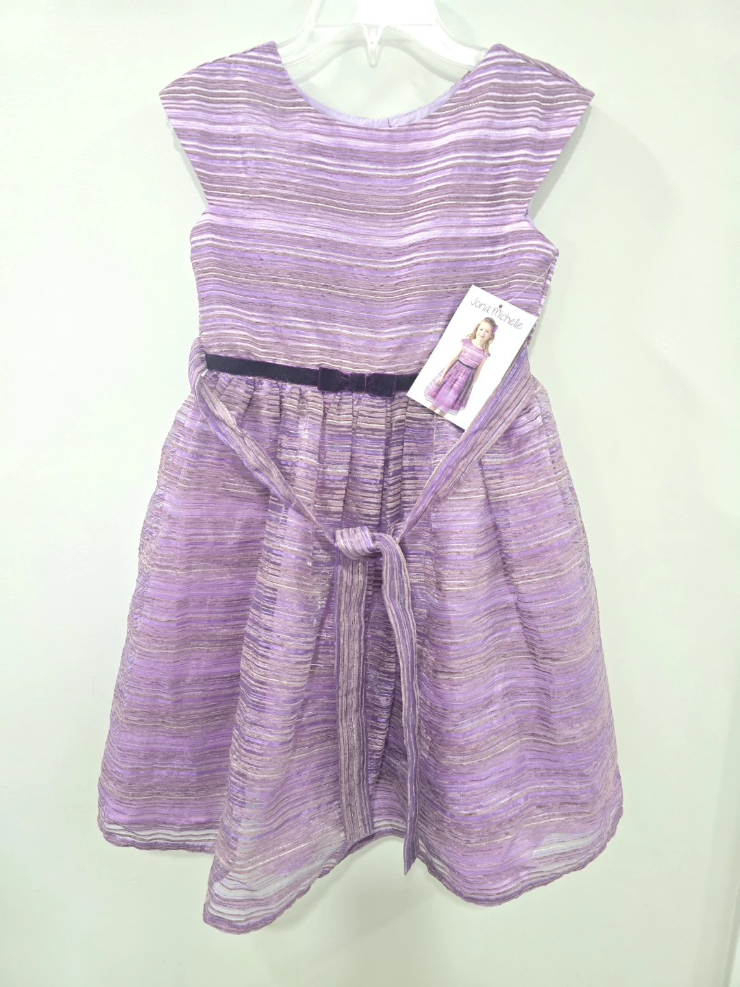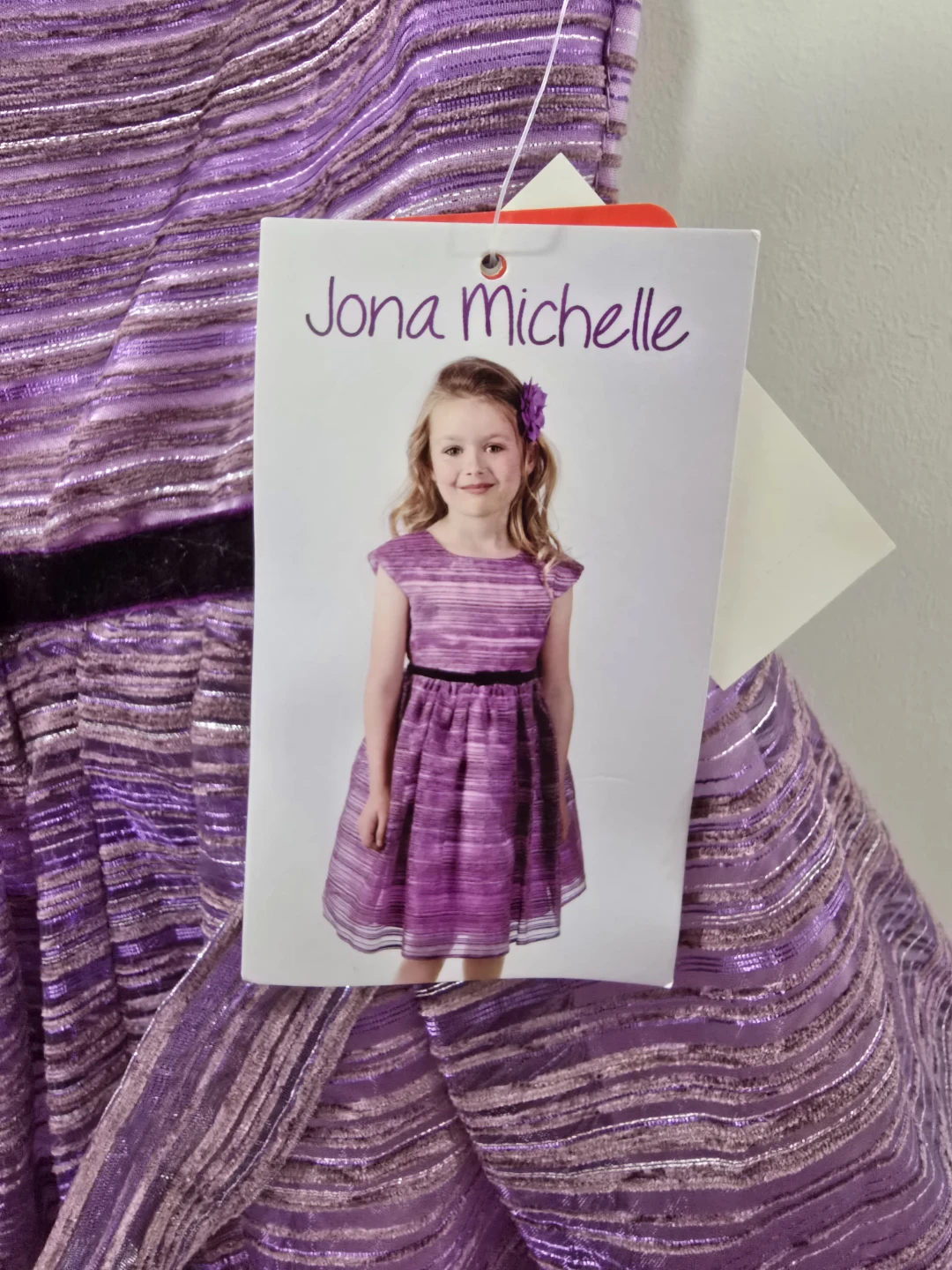 This Jona Michelle dress has a lovely purple striped pattern. It features a tie waist and button closure at the back. The material has a textured, shimmery finish. Perfect for special occasions or parties!