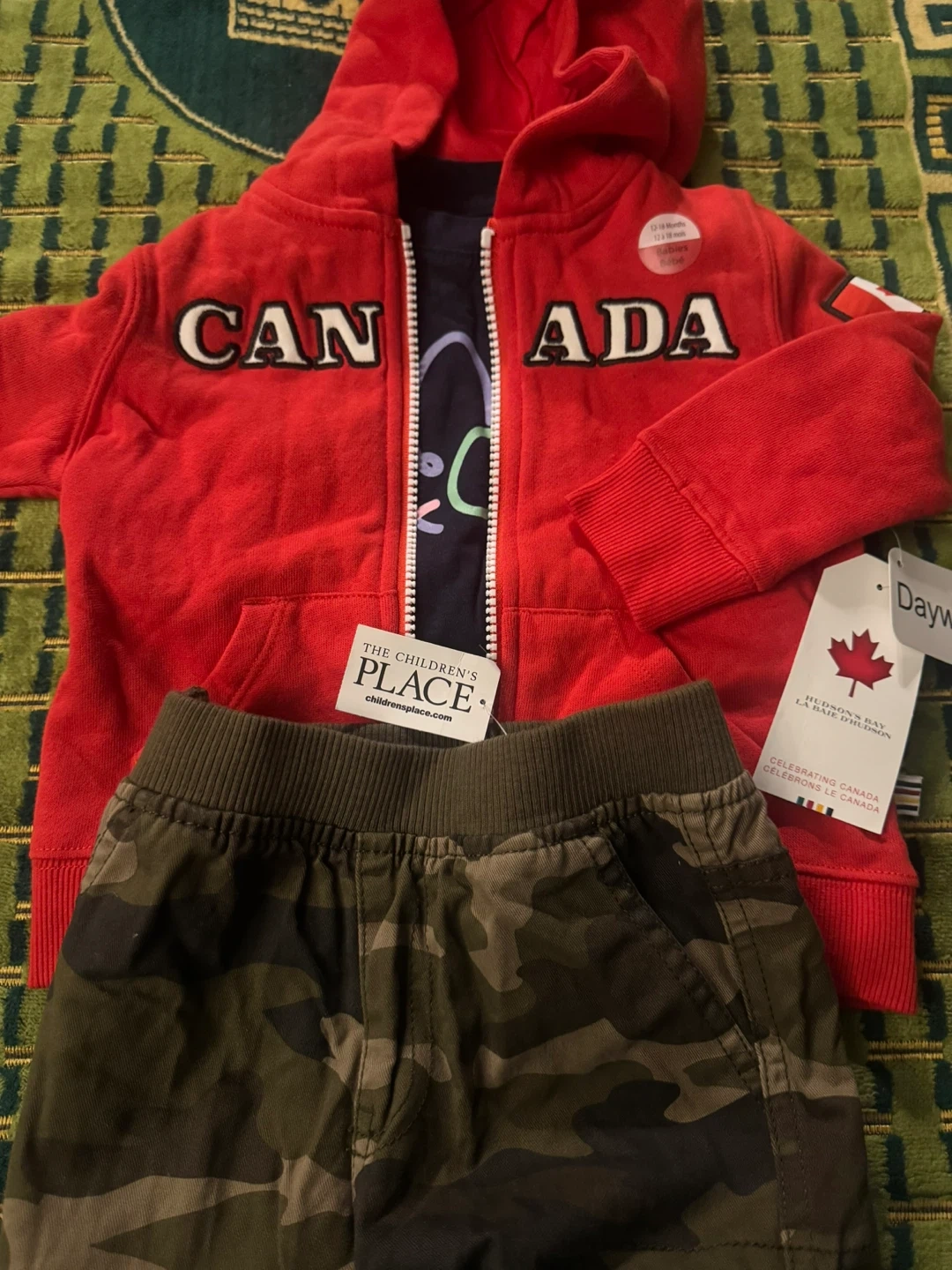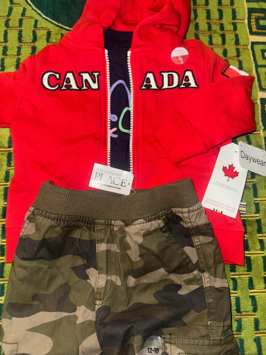 A cute and comfy outfit , This set includes a red hoodie with "CANADA" lettering , a navy shirtand camo shorts. The size is 12-18 months.