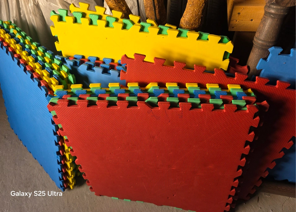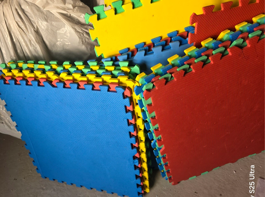 Interlocking foam floor mats. Various colours including red, blue, yellow and green. Great for kids play areas or gyms. Sold as a bundle. I have total 23 pieces