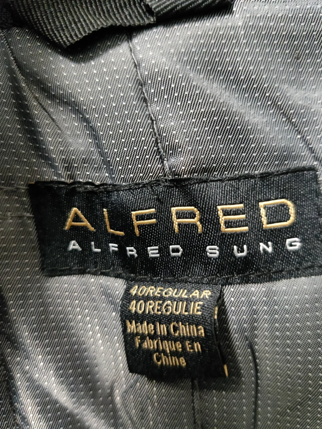 This Alfred Sung blazer jacket is a size 40 regular. It's made from a wool blend and features a removable quilted inner lining for added warmth. Two front pockets and button closure.