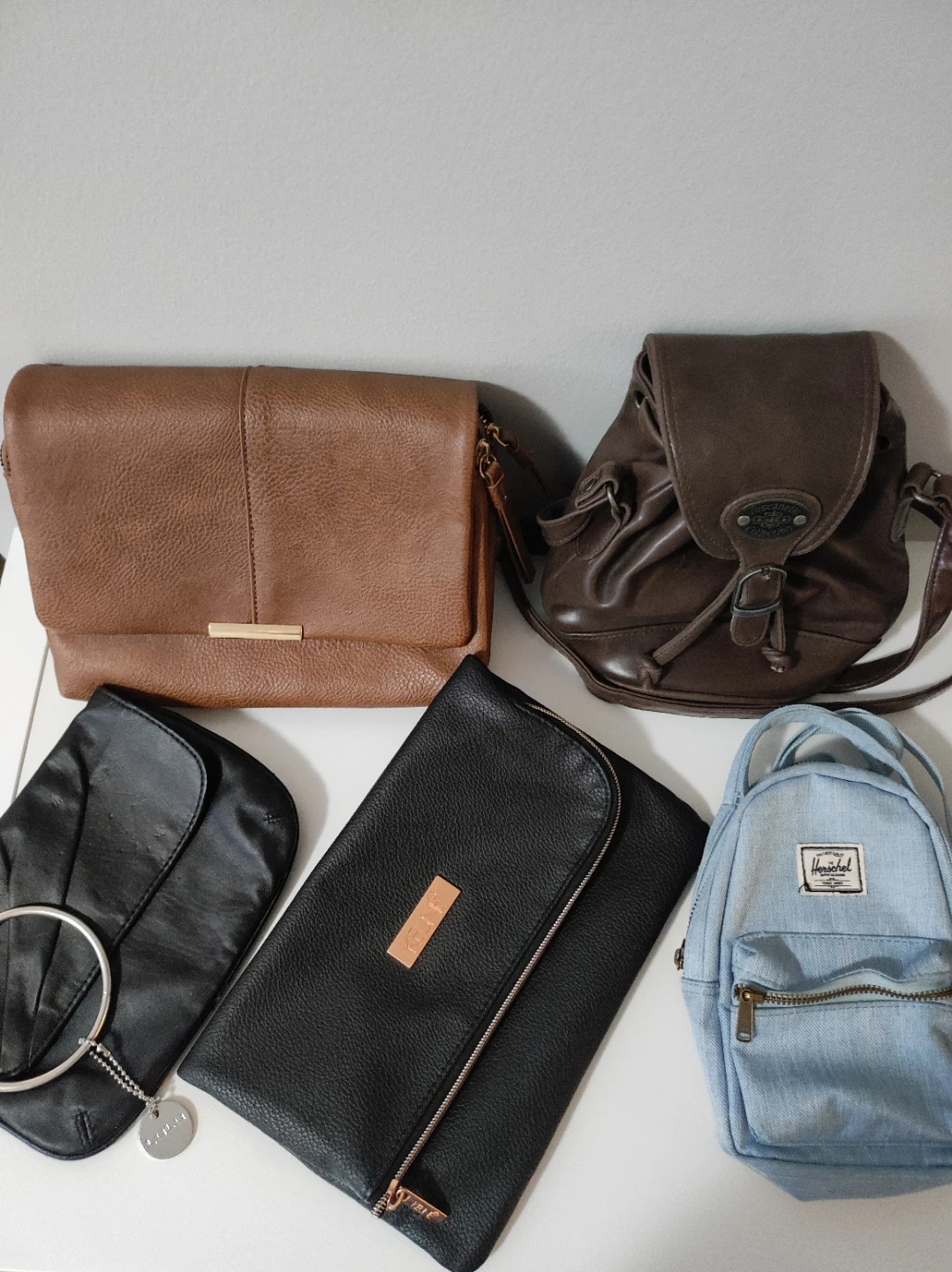 A collection of five assorted women's handbags. Includes a black clutch with a ring handle, a black pebbled leather foldover clutch with a rose gold zipper, a tan faux leather cross-body bag, a distressed brown leather drawstring bucket bag, and a light blue denim Herschel mini backpack. Various materials and colours. $20 for all. Need gone ASAP. Located in East Village Downtown