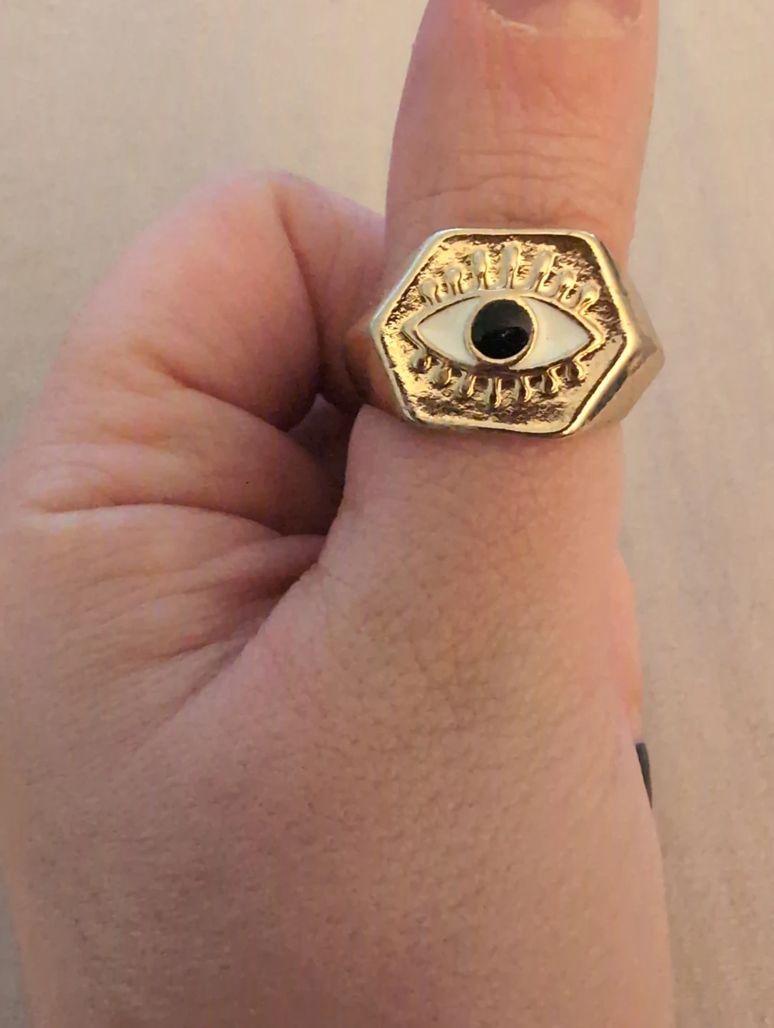 Selling a unique evil eye ring with a gold finish. It's in great condition and adds a cool touch to any outfit!
