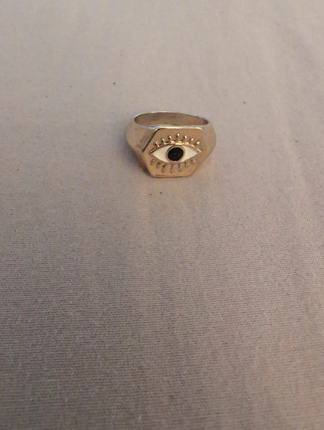Selling a unique evil eye ring with a gold finish. It's in great condition and adds a cool touch to any outfit!