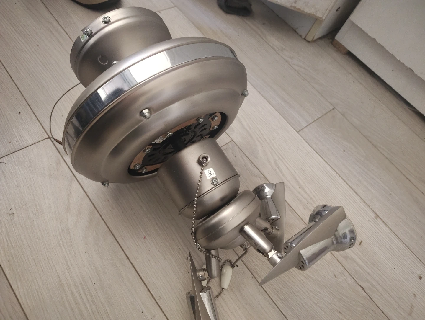 Brushed nickel ceiling fan with integrated lights. Includes pull chains for fan and light control. Some minor scuffs on the metal finish. It's a great way to circulate air and provide light.
