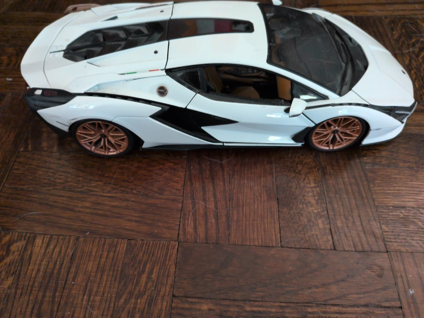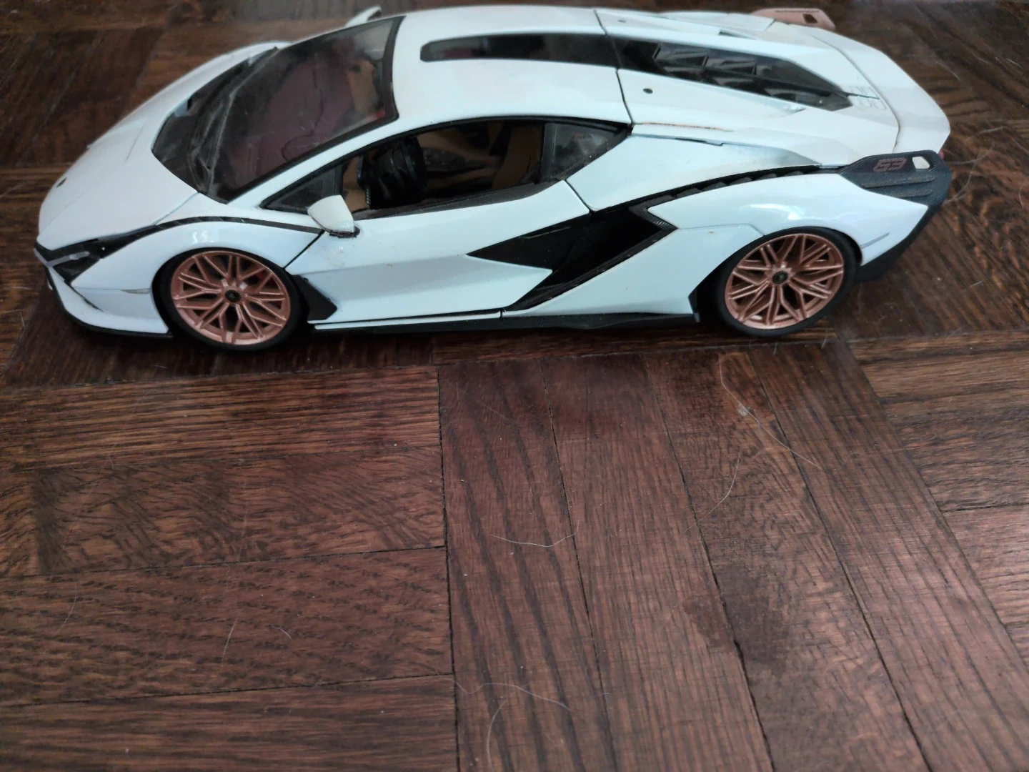 White Lamborghini toy car. It's a die-cast model with rose gold rims. This toy would be great for collectors or kids who love cars!