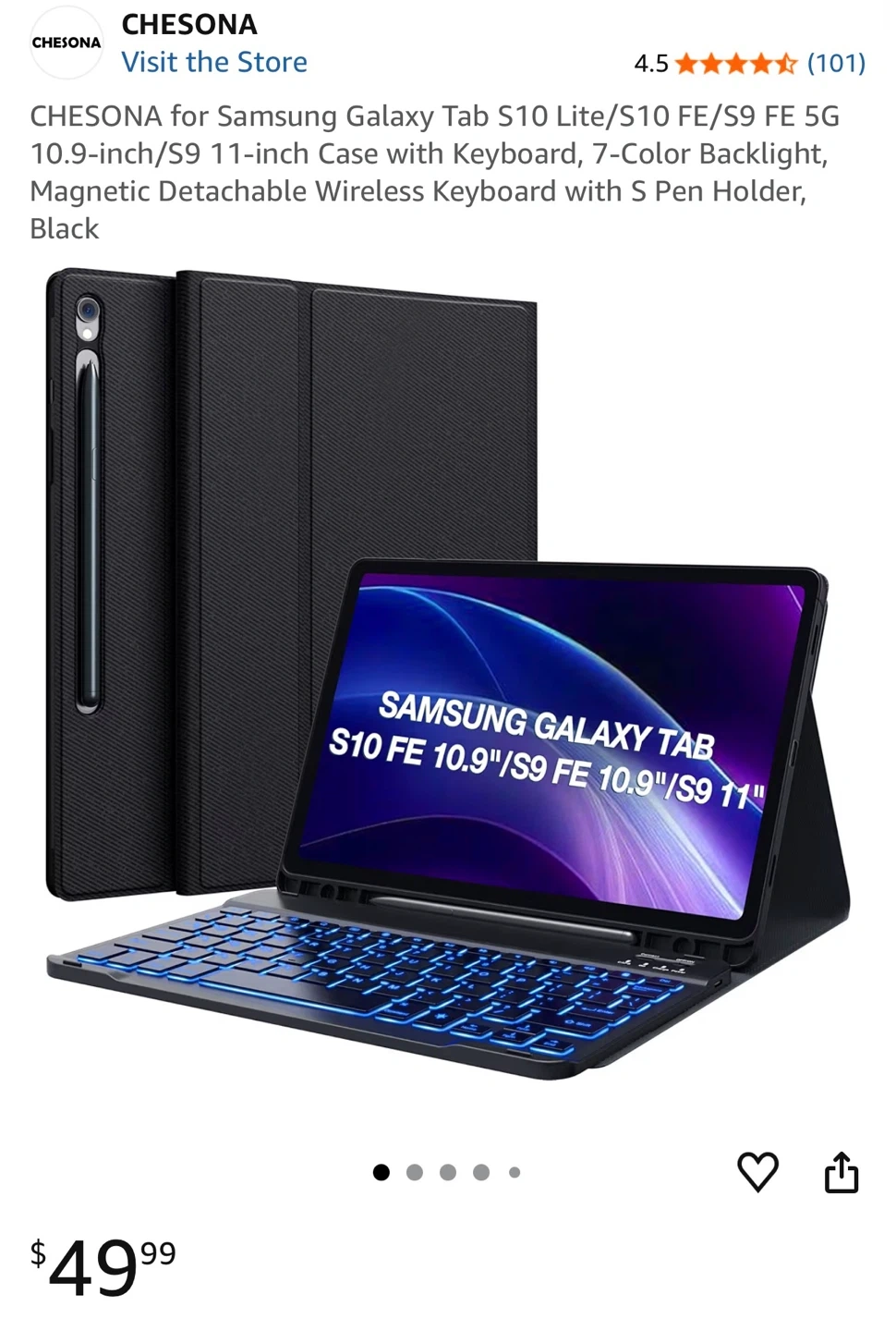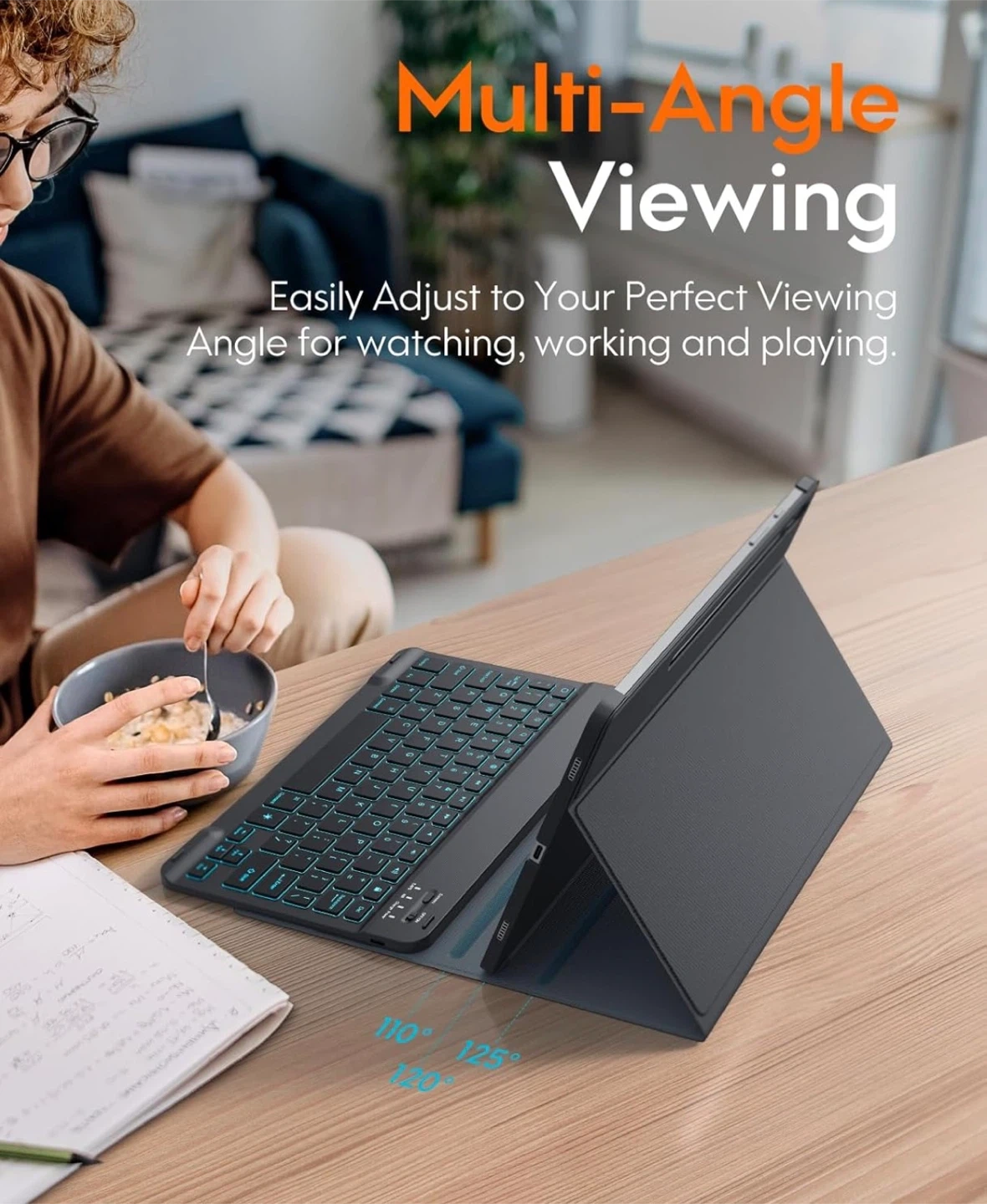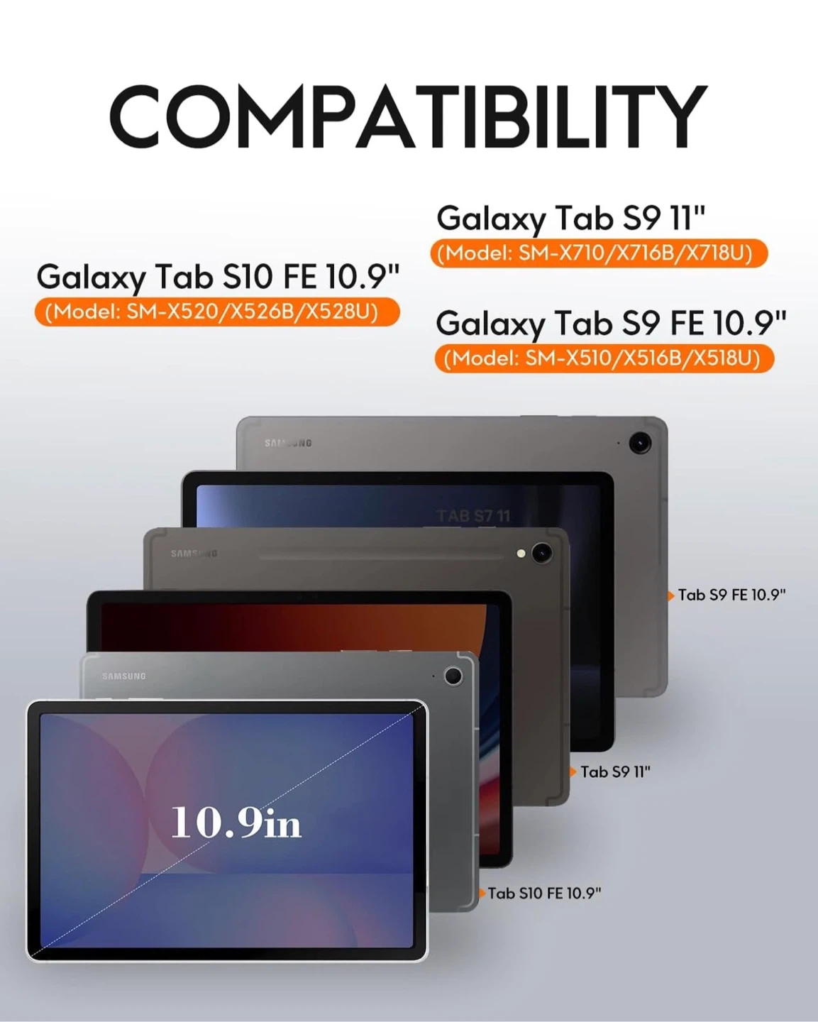 This case features a magnetic detachable keyboard with 7-color backlight and 3 brightness levels. It also includes an S Pen holder with magnetic closure for easy storage and charging. This case is compatible with Samsung Galaxy Tab S10 FE 10.9-inch and S9 FE 10.9-inch, as well as the S9 11-inch model.