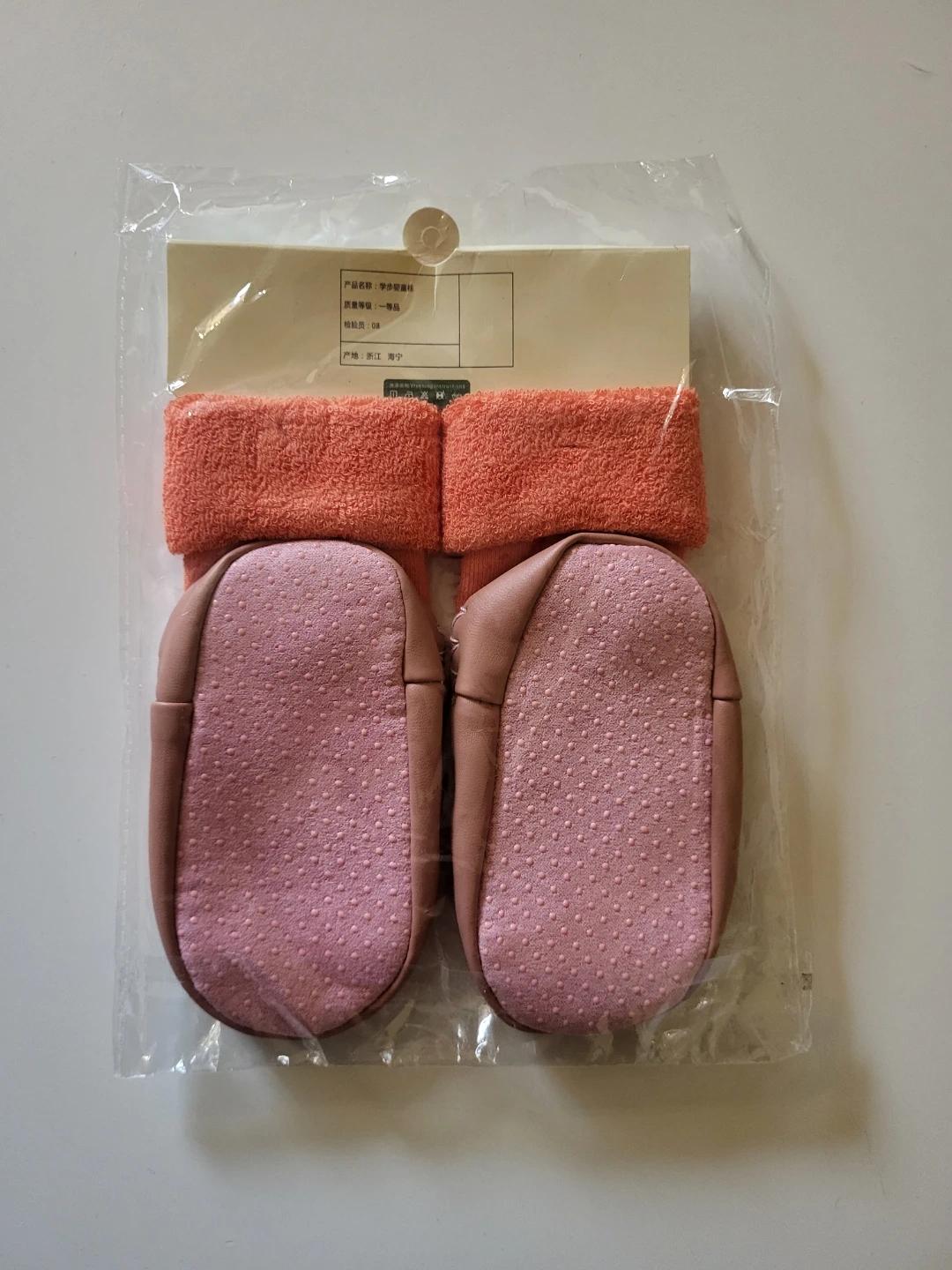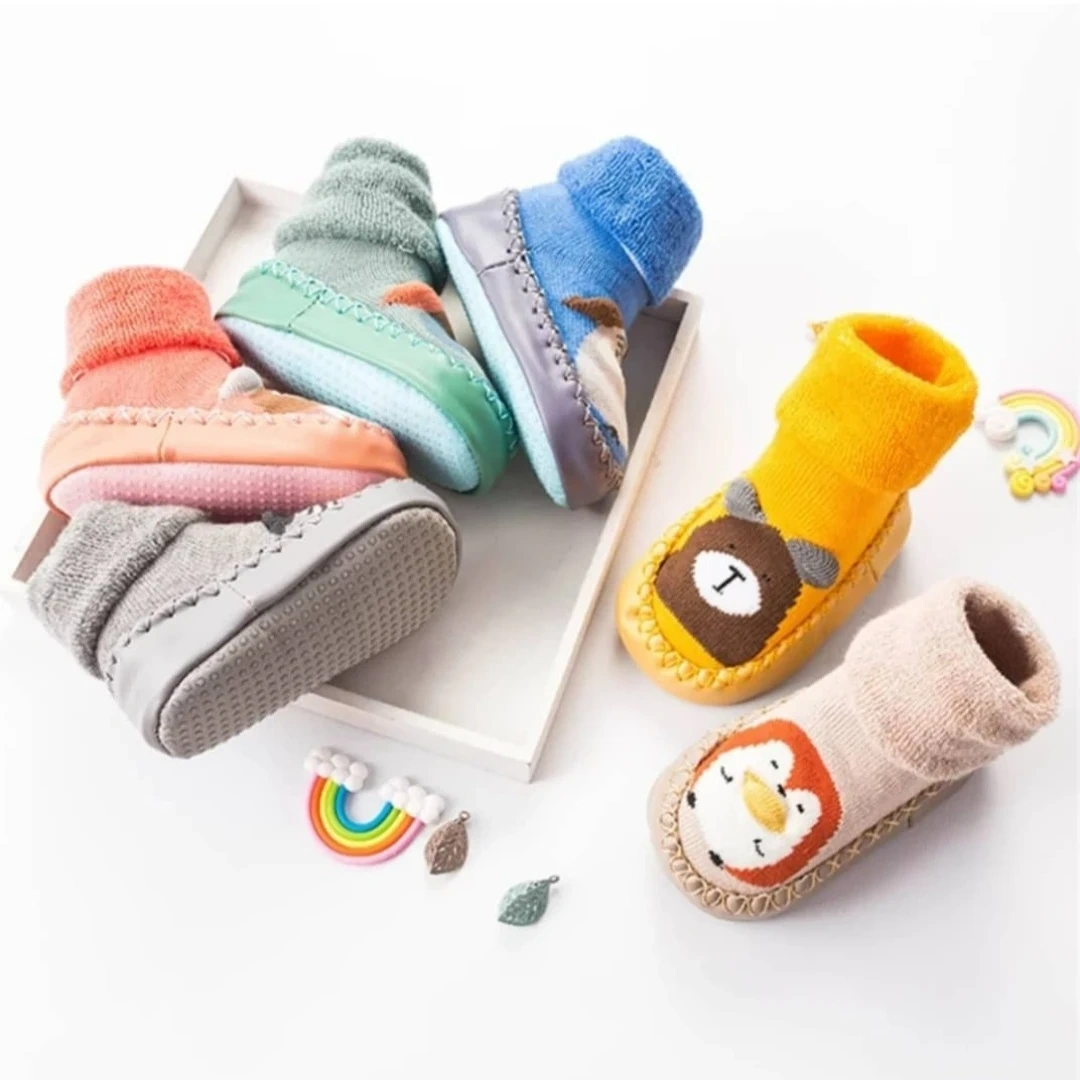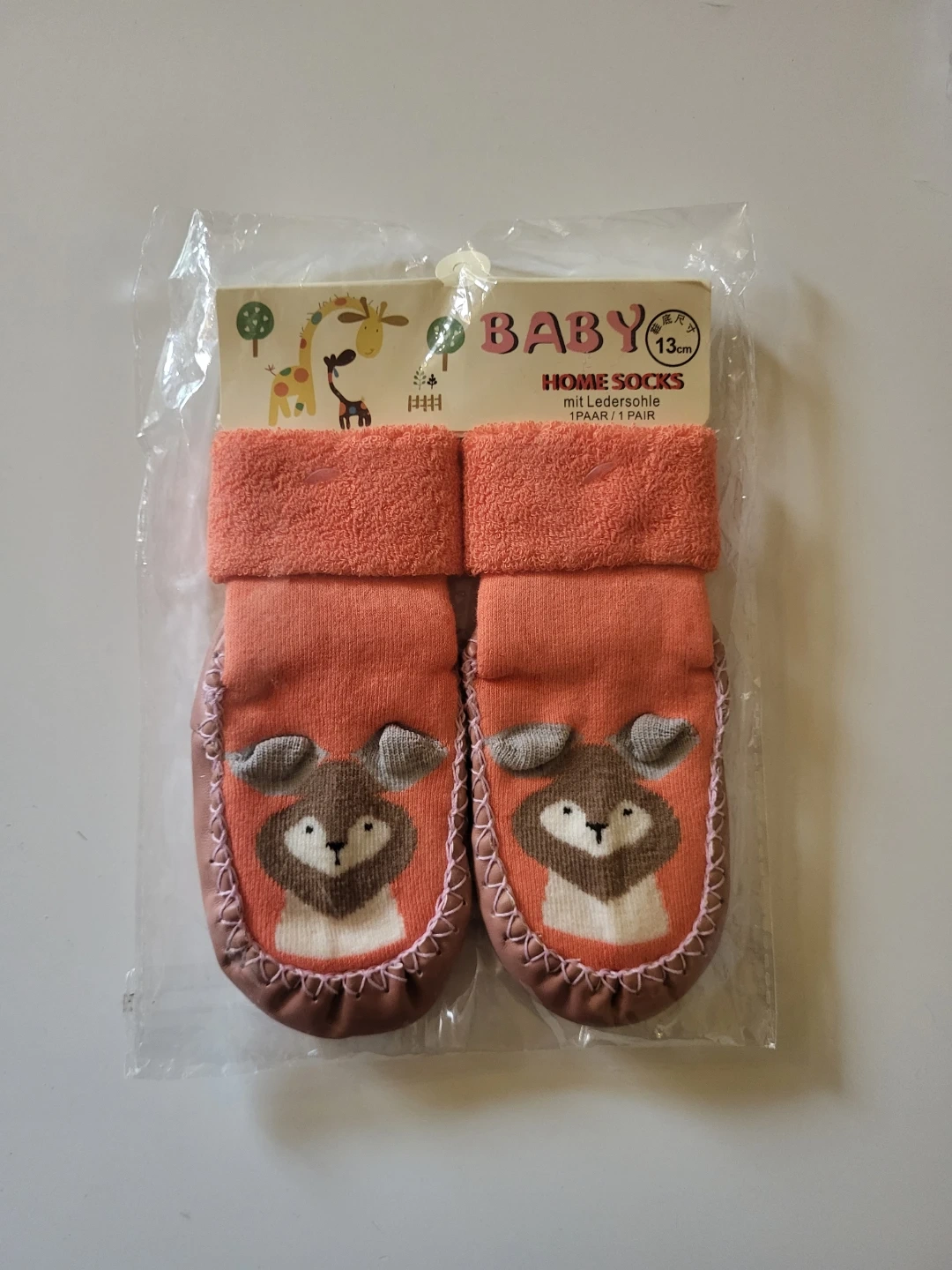 These are baby home socks featuring cute animal designs. They're made with a soft fabric and have a durable sole for grip. Available in 2 adorable styles!