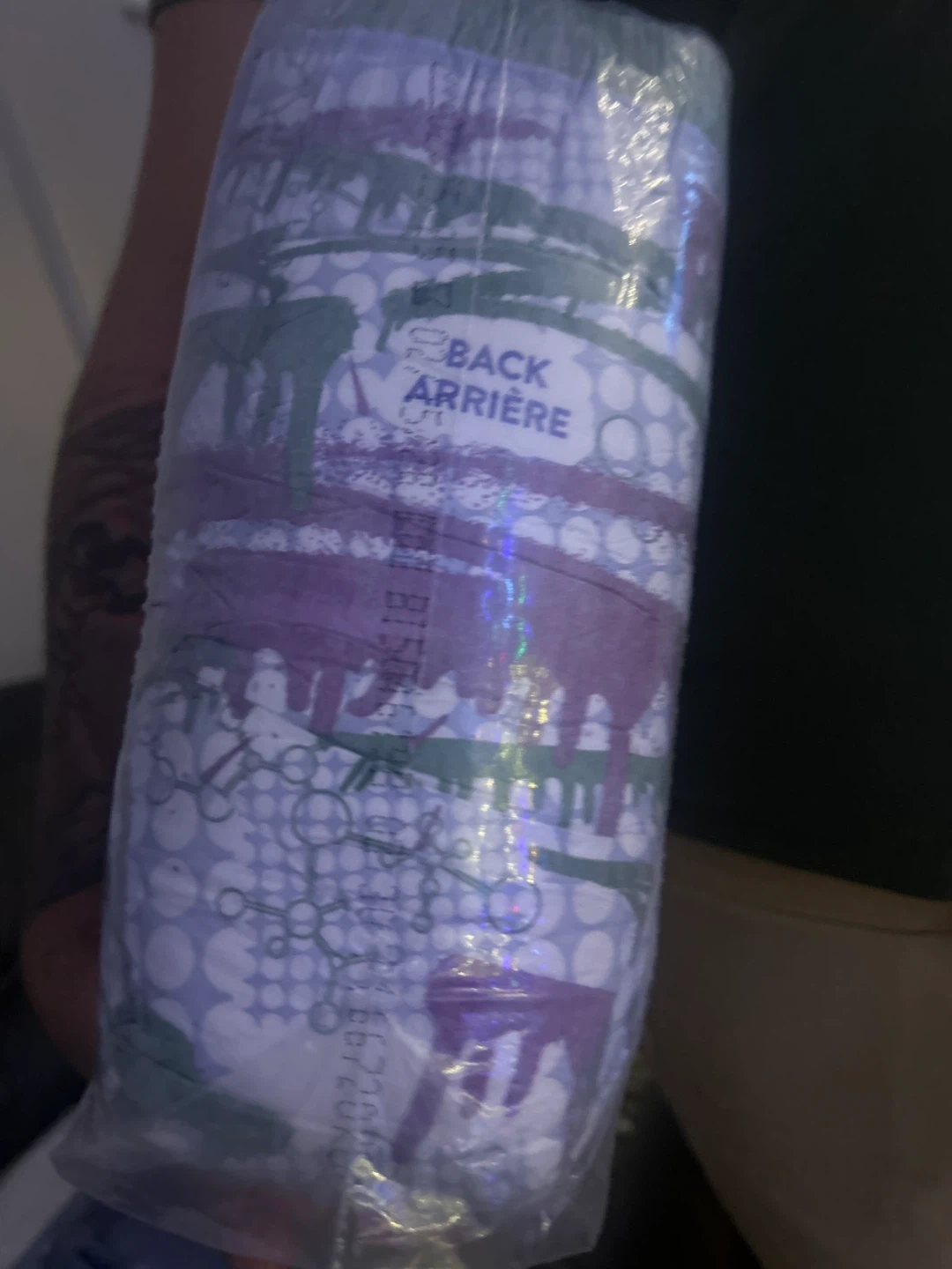 This is a package of diapers. It features a cute bubble pattern with purple and green accents. The package indicates 'BACK ARRIÈRE'. For 1 year olds 30 count