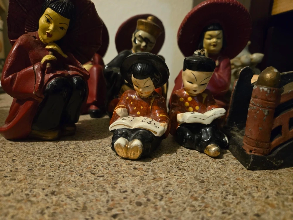 I'm selling a collection of vintage Asian figurines. They feature people in traditional clothing and hats. They are made of a painted material and show some signs of wear consistent with their age