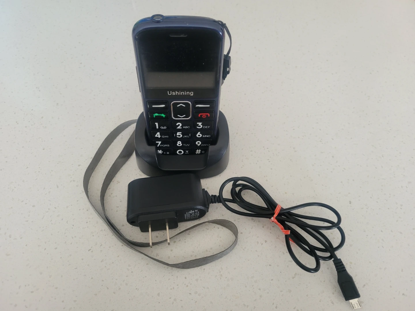 This Ushining basic phone comes in a dark blue colour and includes a charging dock, a power adapter, and a lanyard. It's designed for simple communication needs gently used by a senior.