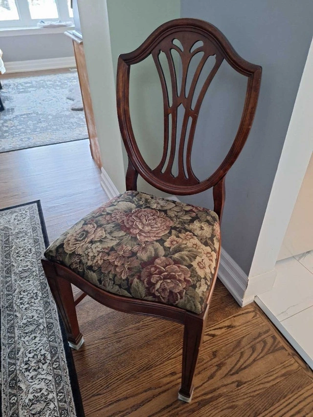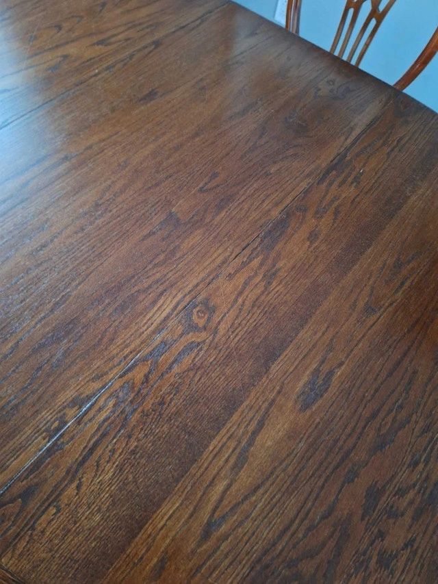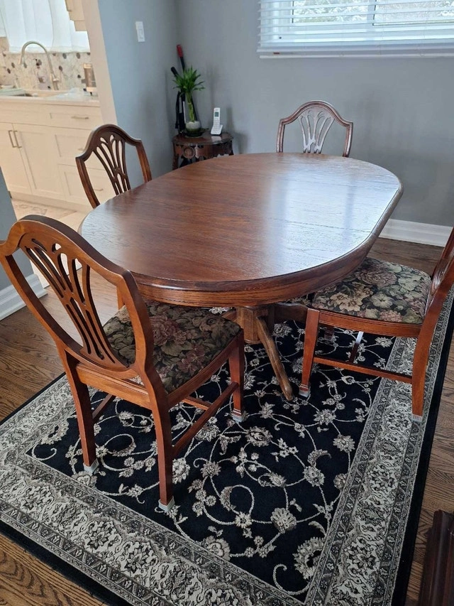 Beautiful solid wood dining set with 4 chairs and a removable leaf. The table is oak with a pedestal base and measures approximately 59" L x 41" W (with leaf) or 41" round (without leaf). The table is in good condition with some light scratches that are barely noticeable once polished. Please refer to the photos. The chairs were purchased from an antique store, and the seats were redone 10 years ago (fabric and stuffing). Asking $290 for the set. Cash only and curbside pickup. Smoke-free home. Please check my other ads.