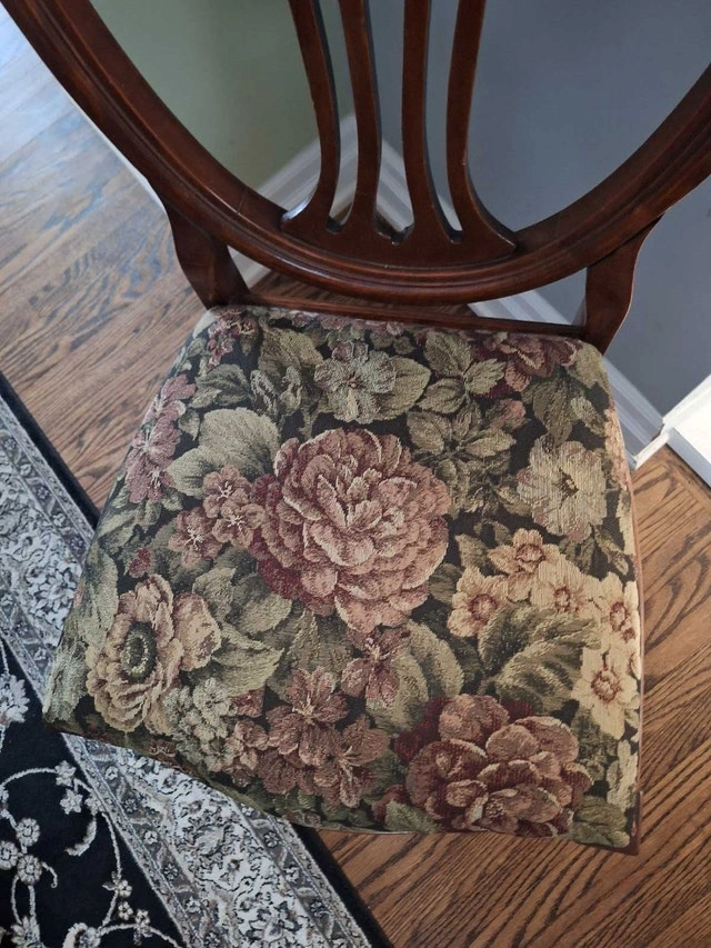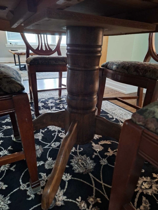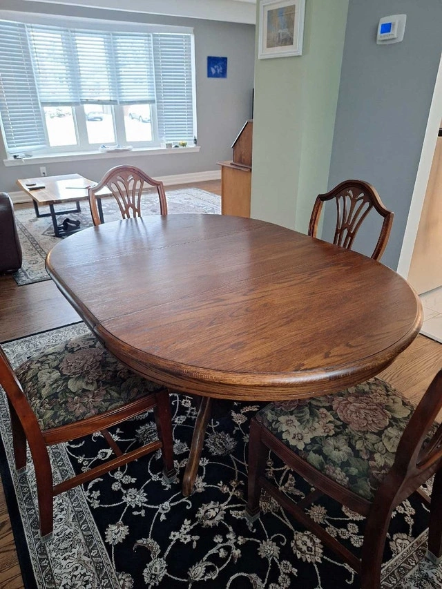 Beautiful solid wood dining set with 4 chairs and a removable leaf. The table is oak with a pedestal base and measures approximately 59" L x 41" W (with leaf) or 41" round (without leaf). The table is in good condition with some light scratches that are barely noticeable once polished. Please refer to the photos. The chairs were purchased from an antique store, and the seats were redone 10 years ago (fabric and stuffing). Asking $290 for the set. Cash only and curbside pickup. Smoke-free home. Please check my other ads.