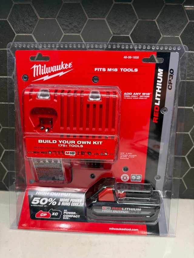 Get your Milwaukee M18 power tool collection started with this new CP3.0 starter kit! This kit includes an M18 battery, charger, and is compatible with over 175 tools in the M18 series, so you can build your ultimate tool setup. Features: * M18™ & M12™ Charger accepts all M18™ & M12™ Batteries * REDLITHIUM™ HIGH OUTPUT CP3.0 battery pack provides 50% more power and runs cooler vs M18™ REDLITHIUM™ CP battery pack. If the ad is up, it's available!