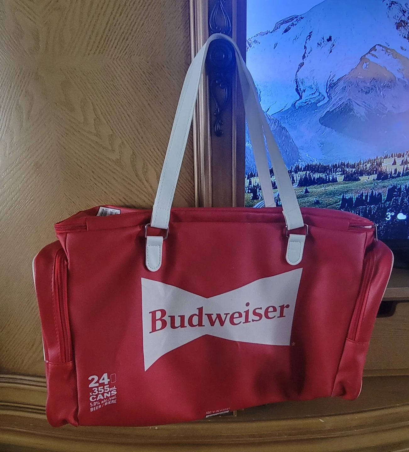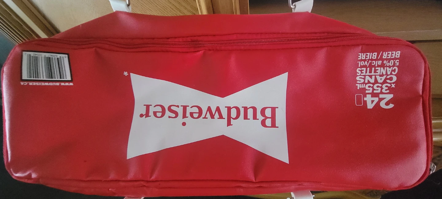 This red Budweiser cooler bag is designed to hold 24 cans of 355ml beer. It features white handles and a zippered closure. It's perfect for picnics or summer gatherings!