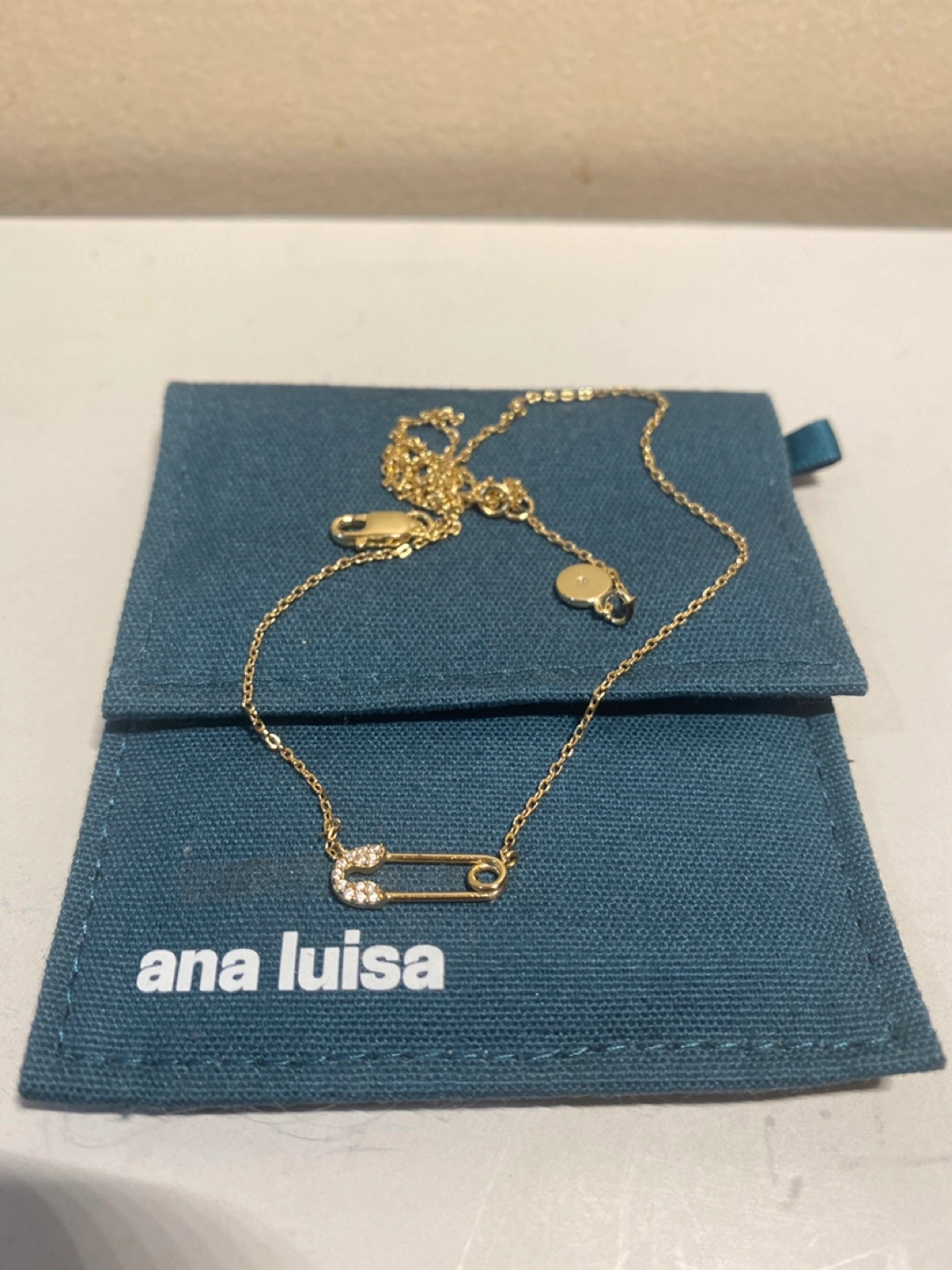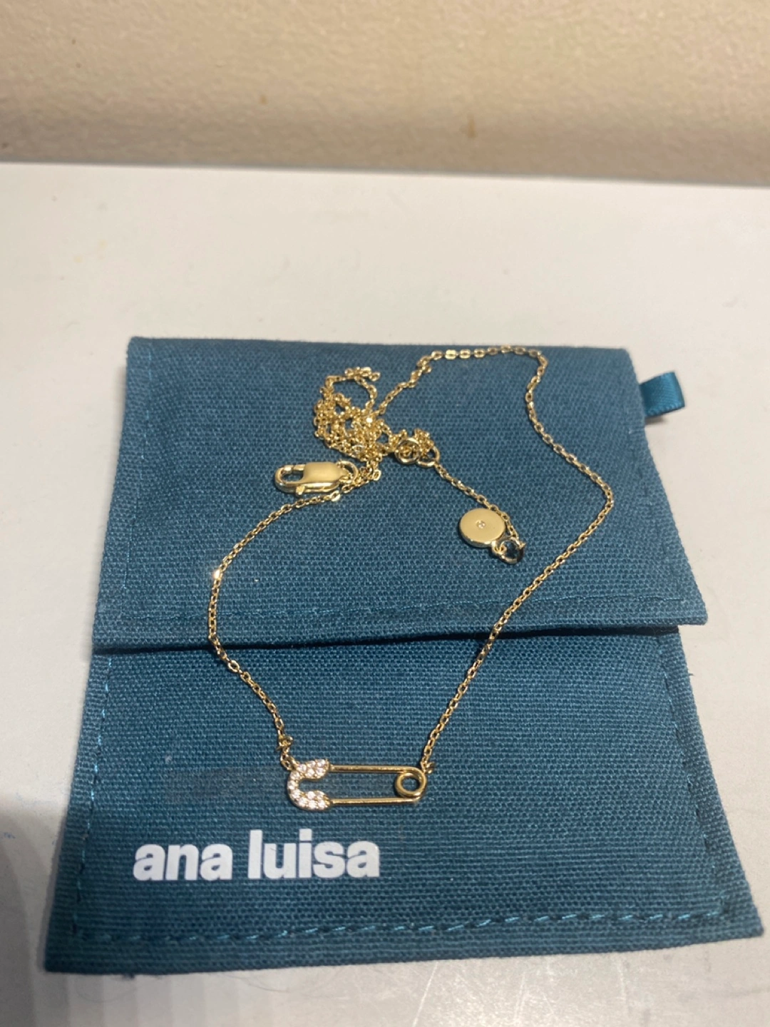 Delicate gold chain necklace. Features a small safety pin pendant with clear stones. Comes in original Ana Luisa pouch.