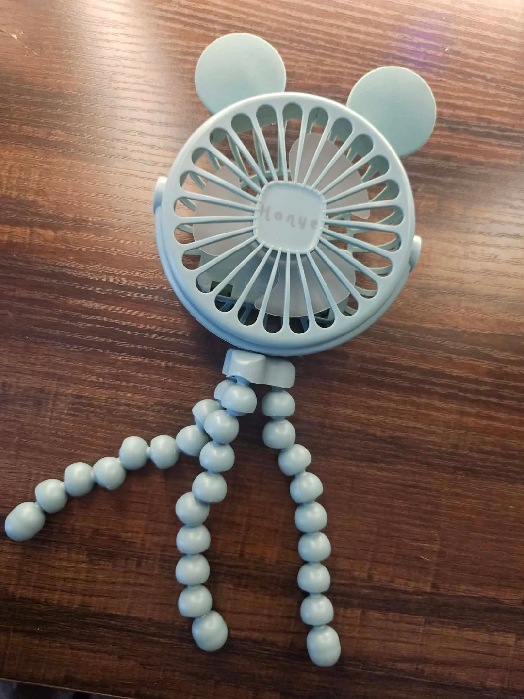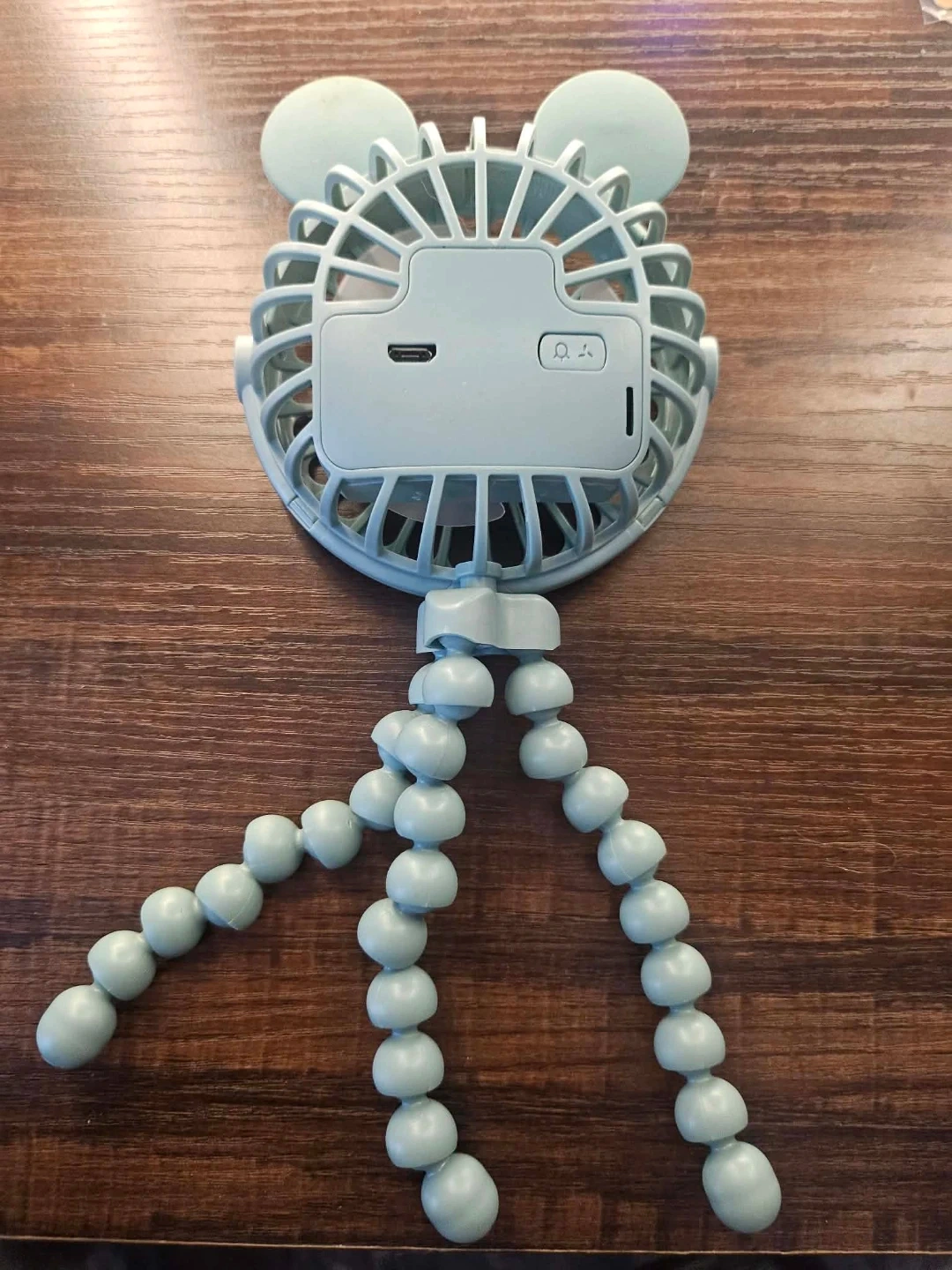 This is a Hanye mini fan with a flexible tripod stand. It's great for cooling down on the go! It has a USB charging port for convenience.