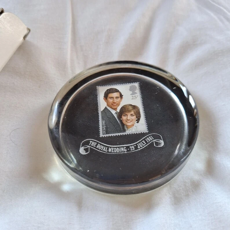 Commemorative paperweight celebrating the Royal Wedding of Charles and Diana. Features a 25p stamp and the date 29th July 1981. A nice keepsake from a historic event!
