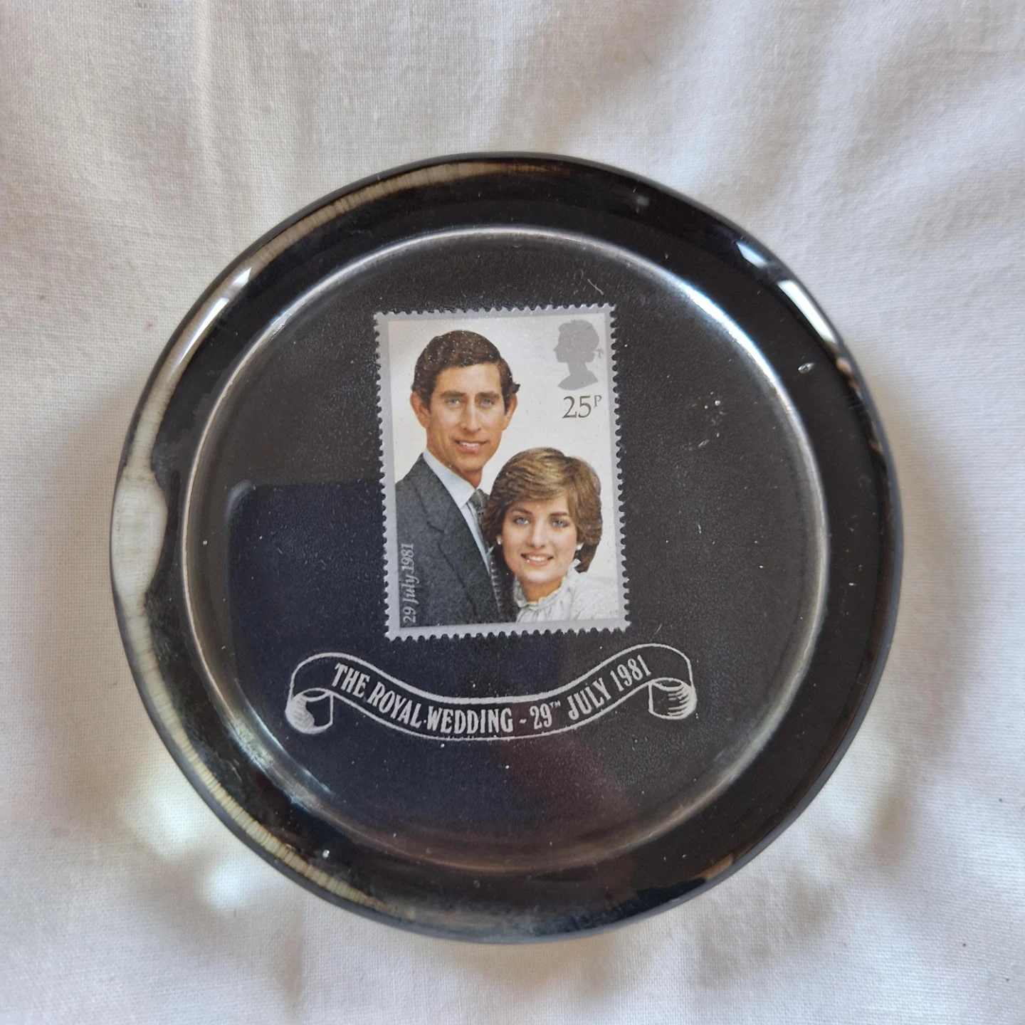 Commemorative paperweight celebrating the Royal Wedding of Charles and Diana. Features a 25p stamp and the date 29th July 1981. A nice keepsake from a historic event!