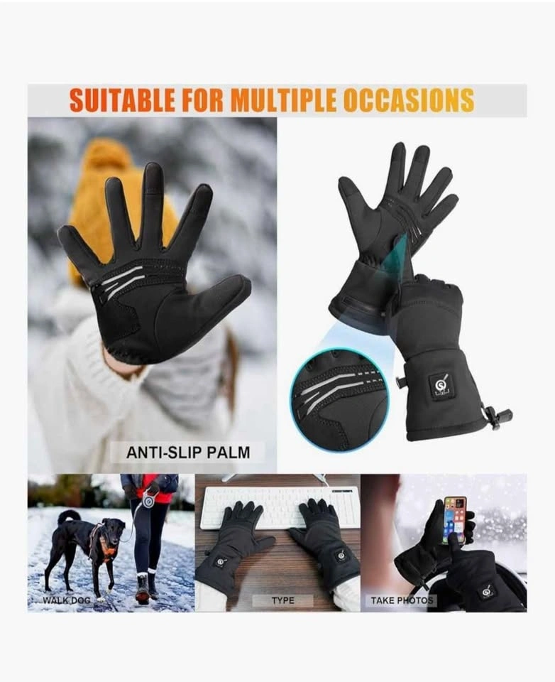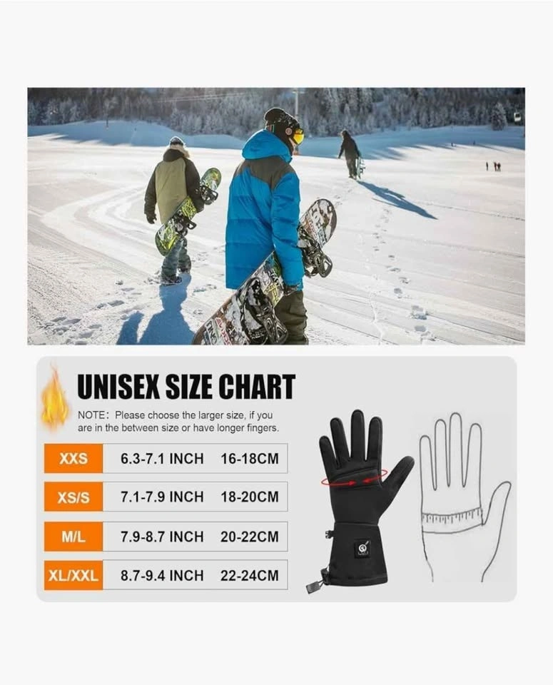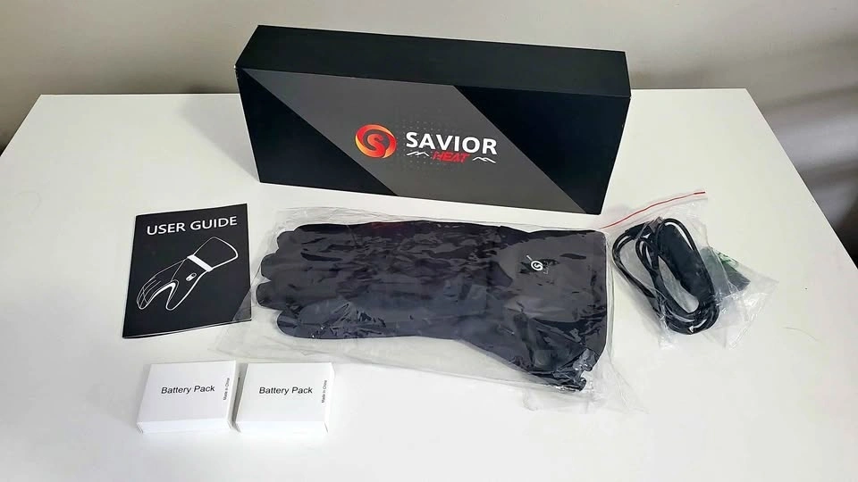 Brand new SAVIOR HEAT rechargeable heated gloves, size M-L. These gloves are super warm with an upgraded smart controller and power display. Has three heat settings: High (140-150°F for 2-2.5 hours), Medium (122-131°F for 3-3.5 hours), and Low (100-113°F for 6-6.5 hours). Touch-screen compatible fingertips. Comes with battery packs, charger, and user guide.