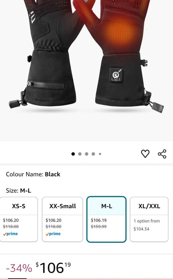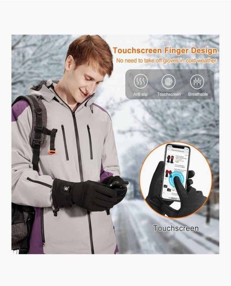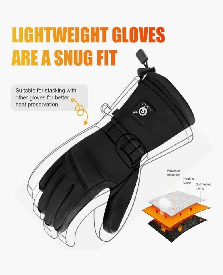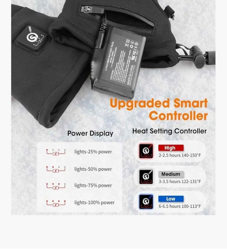 Brand new SAVIOR HEAT rechargeable heated gloves, size M-L. These gloves are super warm with an upgraded smart controller and power display. Has three heat settings: High (140-150°F for 2-2.5 hours), Medium (122-131°F for 3-3.5 hours), and Low (100-113°F for 6-6.5 hours). Touch-screen compatible fingertips. Comes with battery packs, charger, and user guide.