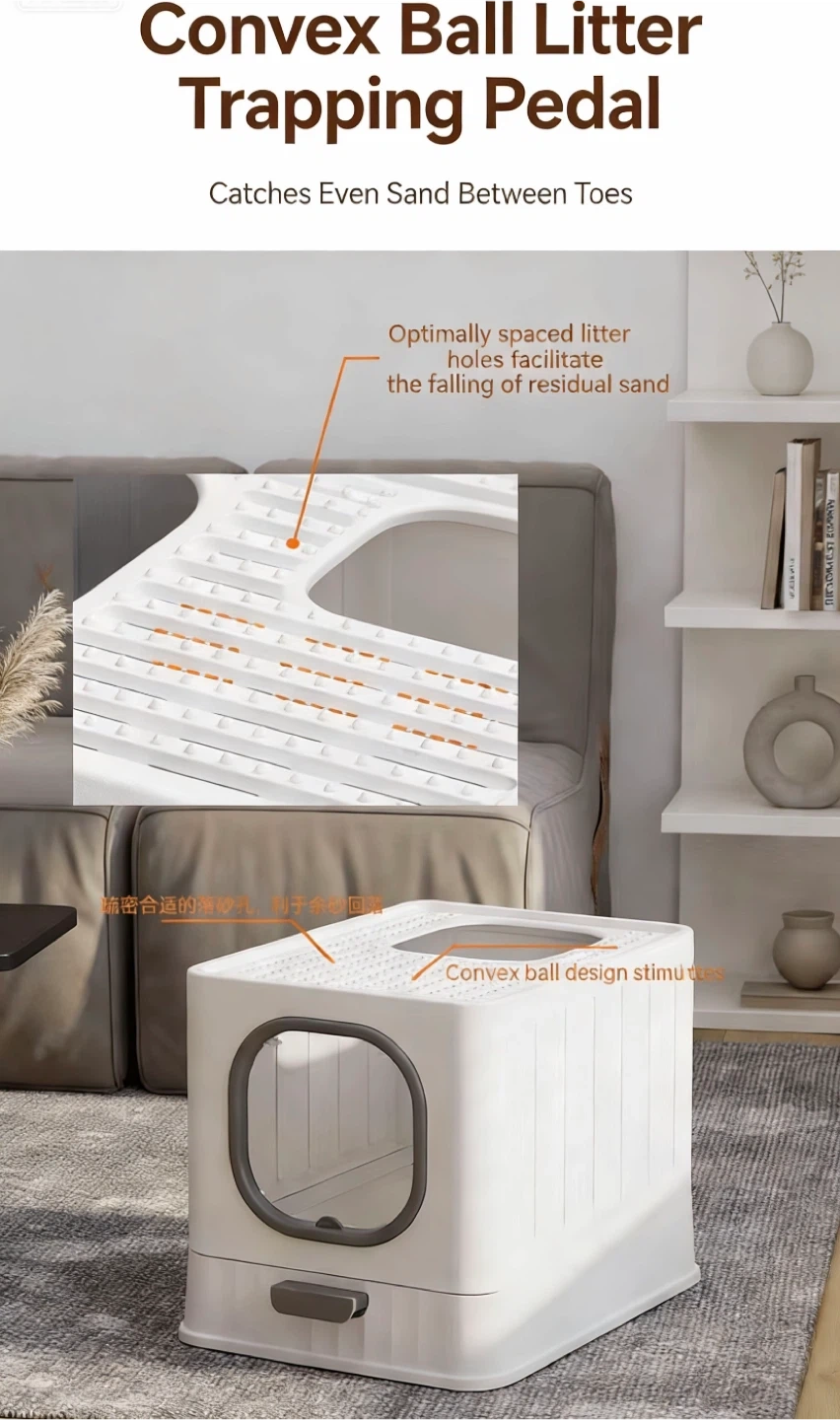 This enclosed cat litter box features an elongated sifting grid and a transparent resin curtain. It has a drawer-type design with a handle for easy cleaning and includes a litter scoop. Dimensions are 38cm x 51cm x 39cm.