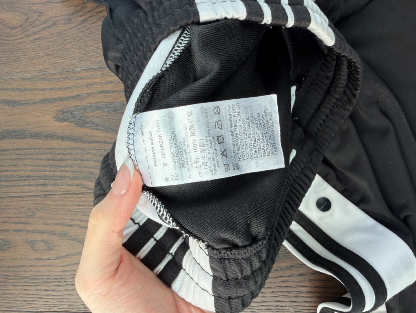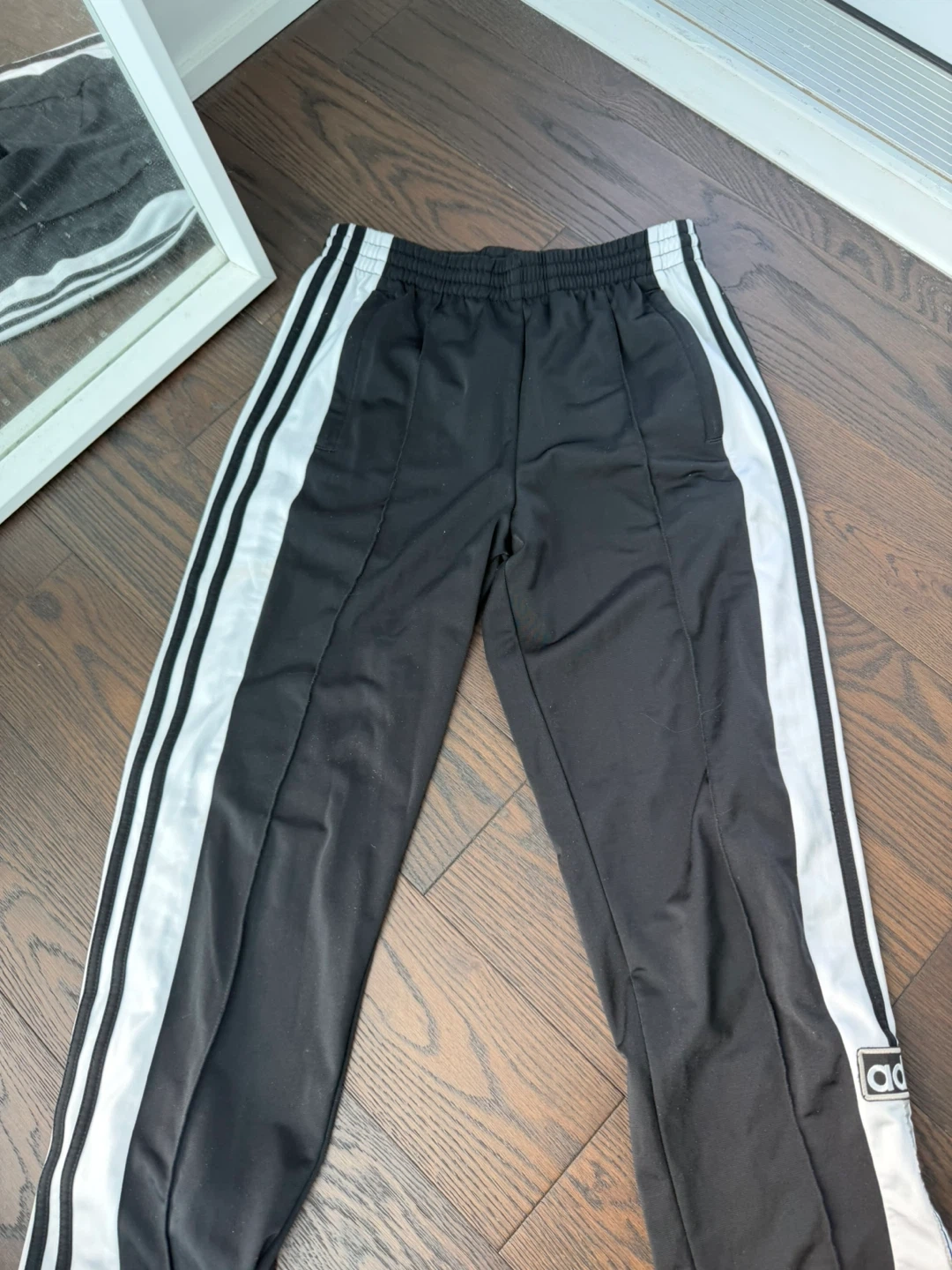 Black Adidas Adibreak track pants featuring the iconic white 3-stripes down the sides. These pants have snap buttons along the leg for adjustable styling. Made from polyester material.