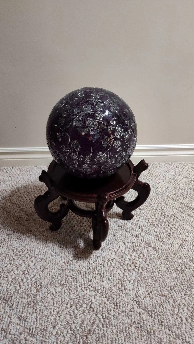 This striking purple garden globe, adorned with delicate silver floral patterns, adds a touch of elegance to any indoor or outdoor space. It's in new condition, since it was never used outside. The stand is available for $50, sold separately.