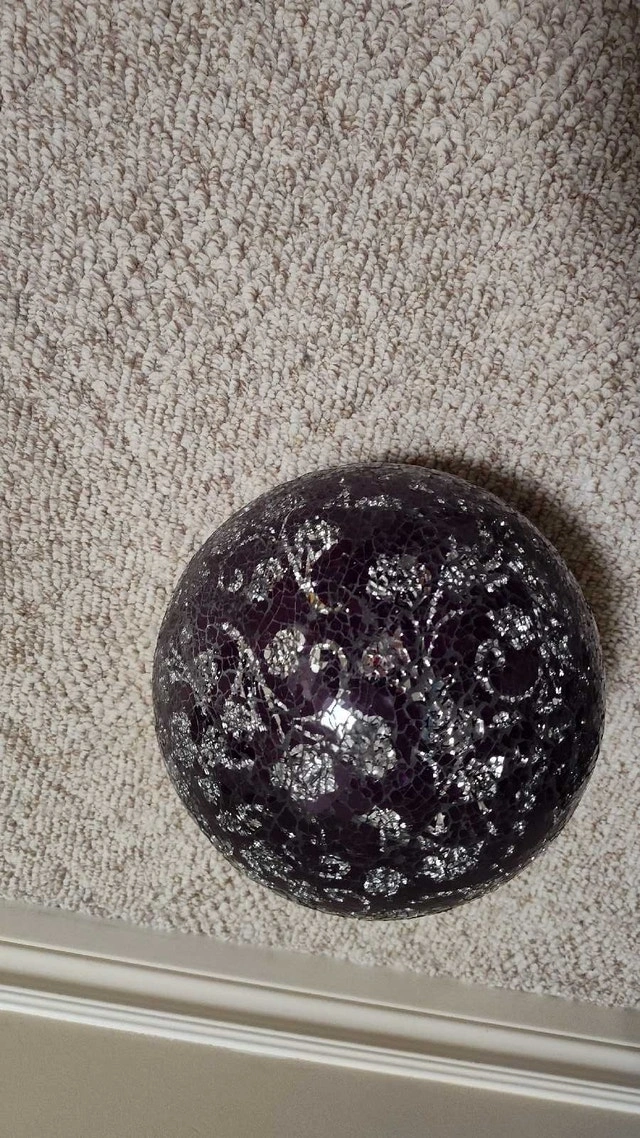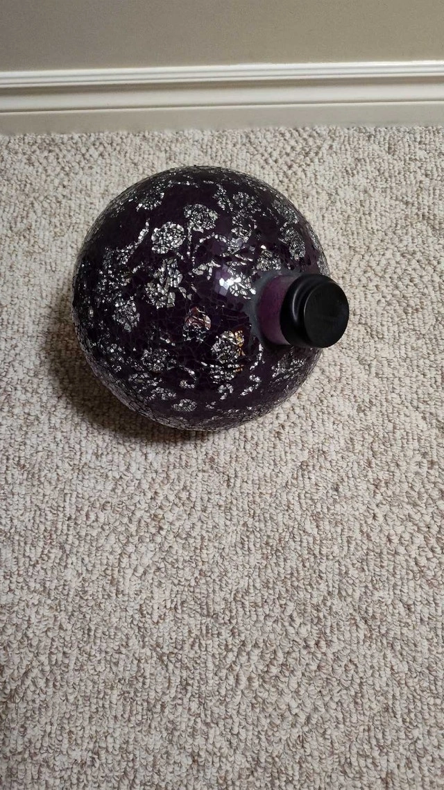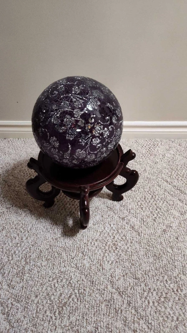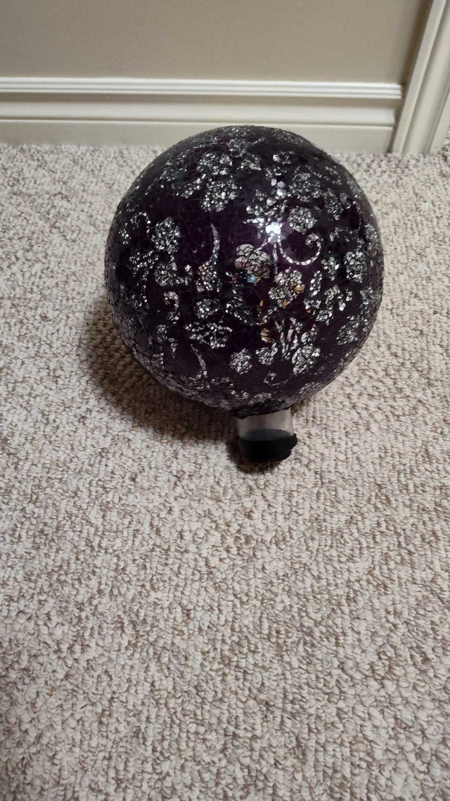This striking purple garden globe, adorned with delicate silver floral patterns, adds a touch of elegance to any indoor or outdoor space. It's in new condition, since it was never used outside. The stand is available for $50, sold separately.