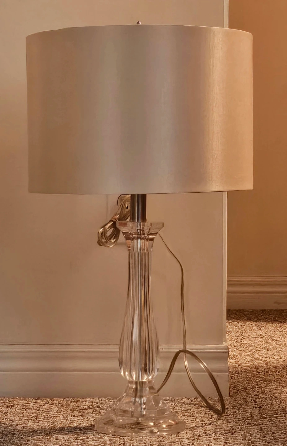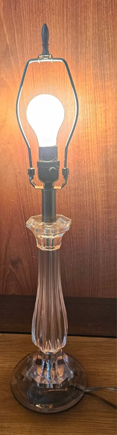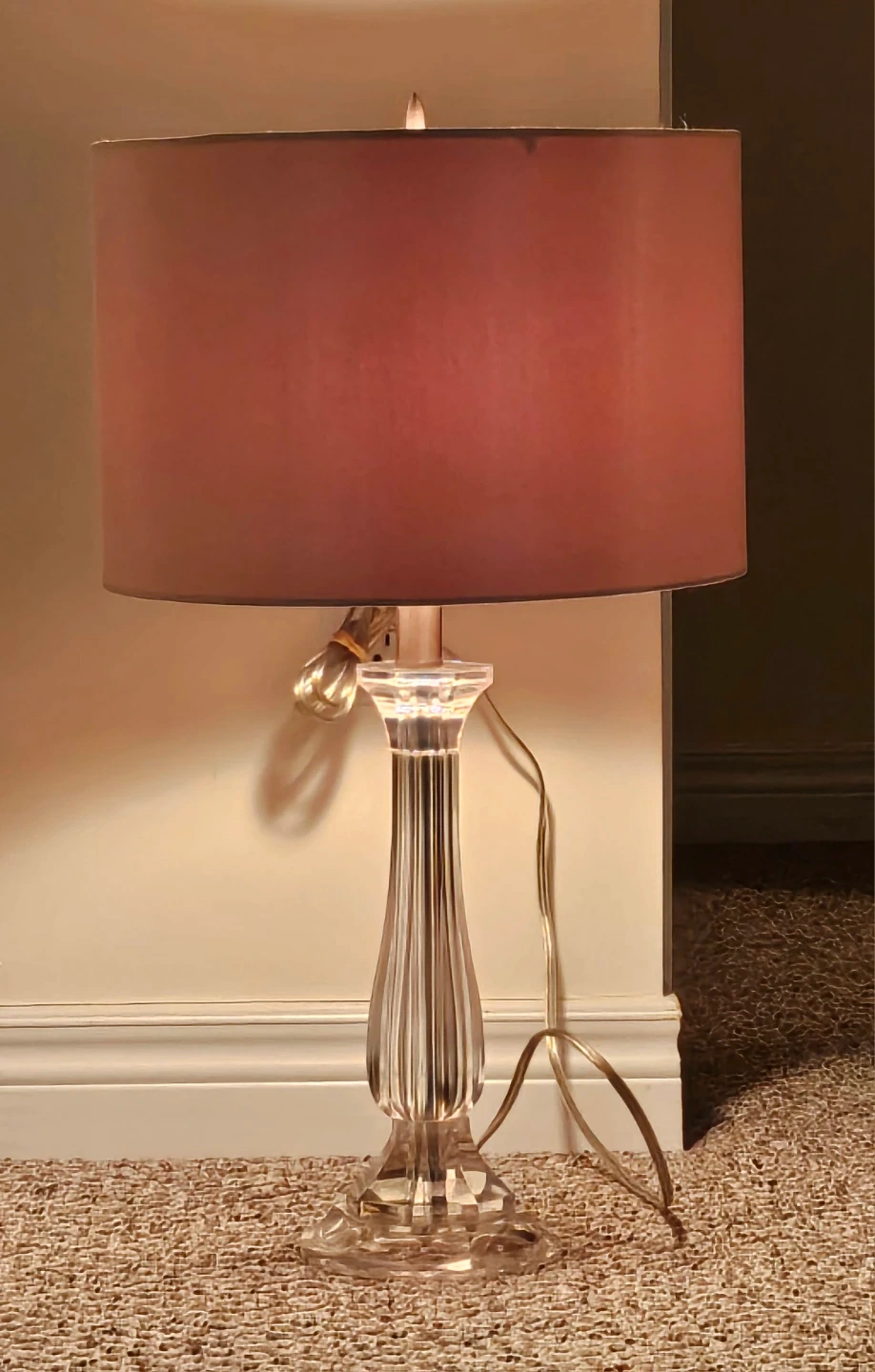 Lightweight lucite lamp, believed to be from the 70's - 80's. Tri-lite. 25" high to the tip of the finial. Shade is not original to the lamp but looks fantastic.