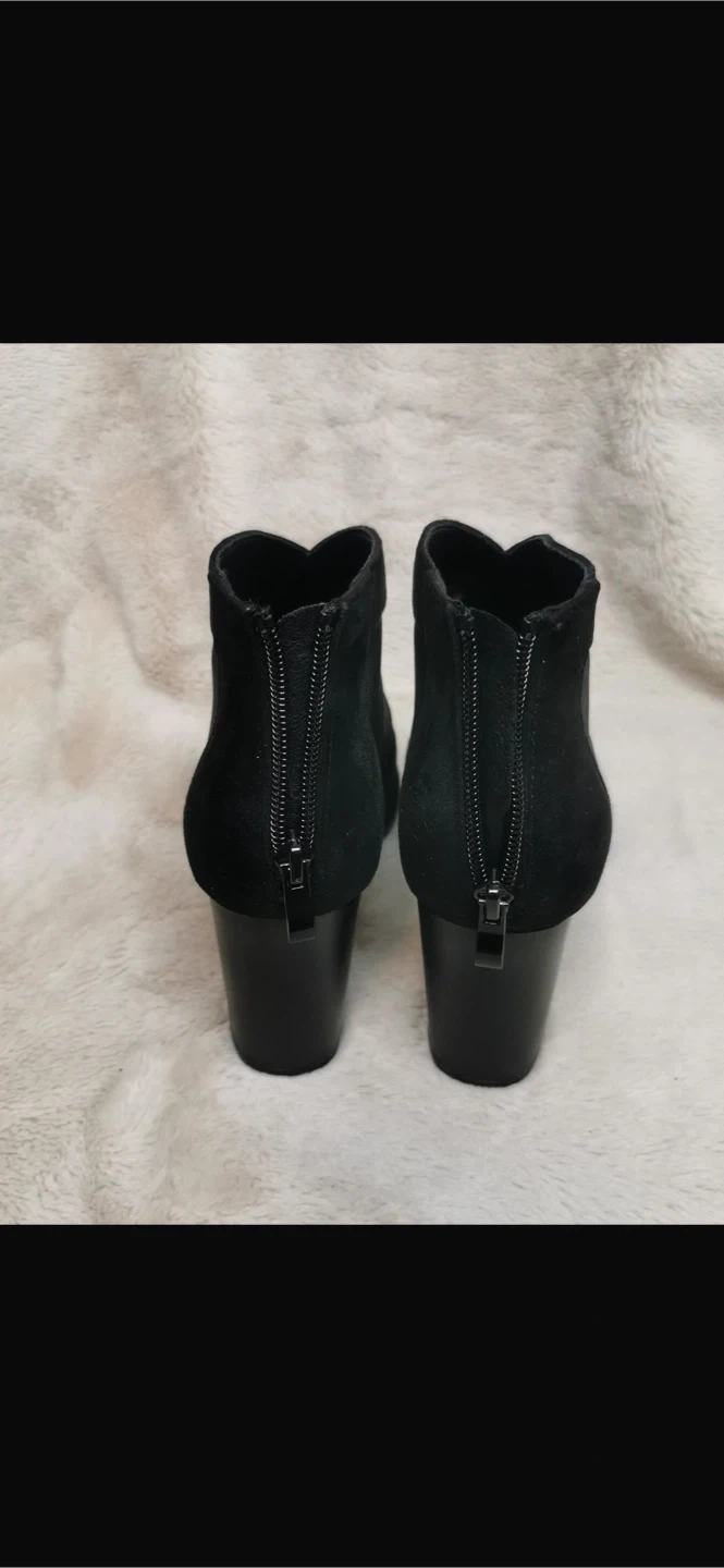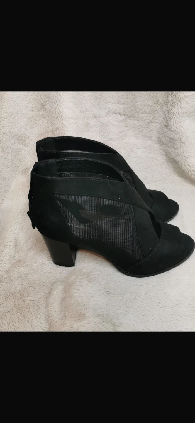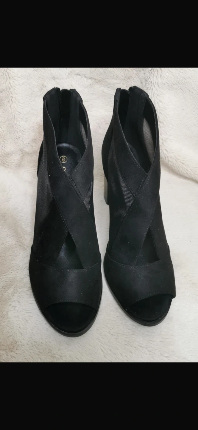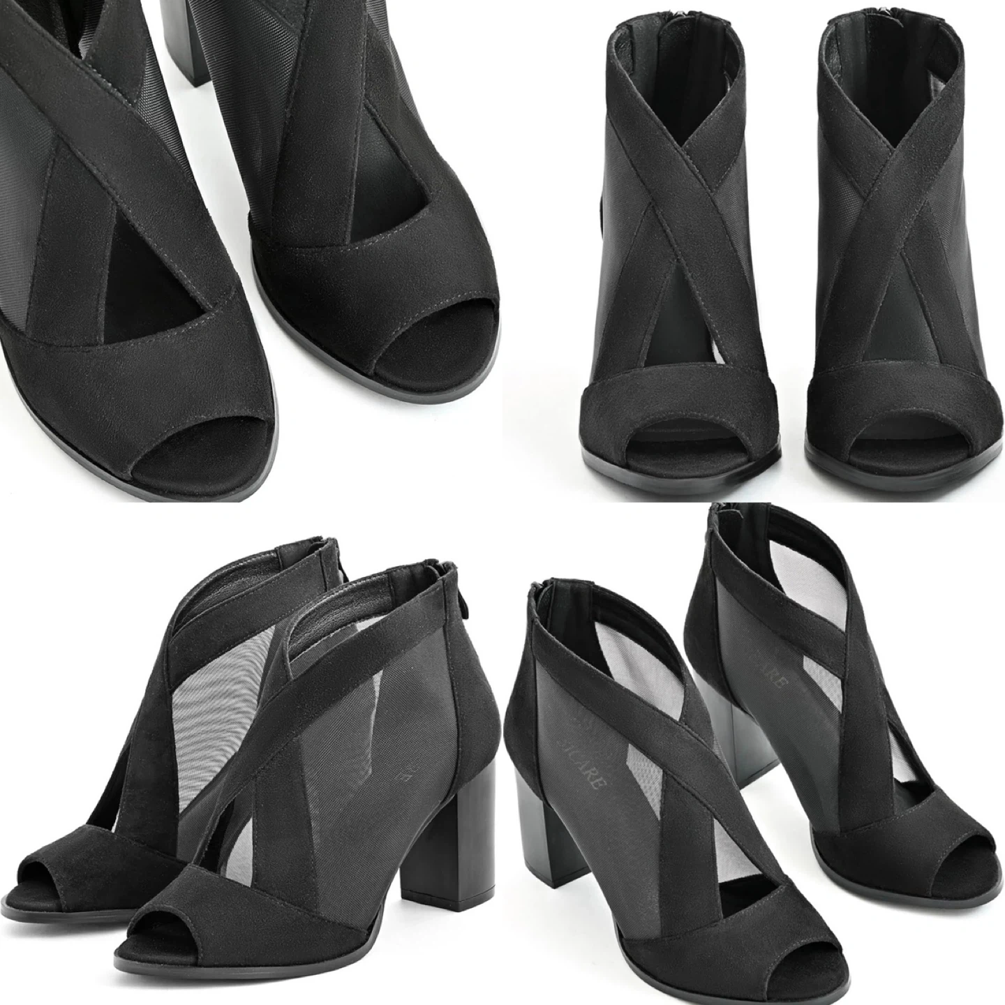 Stylish black booties with a chic peep-toe design. These feature a breathable mesh panel and a comfortable block heel. Zipper closure at the back for easy on and off.