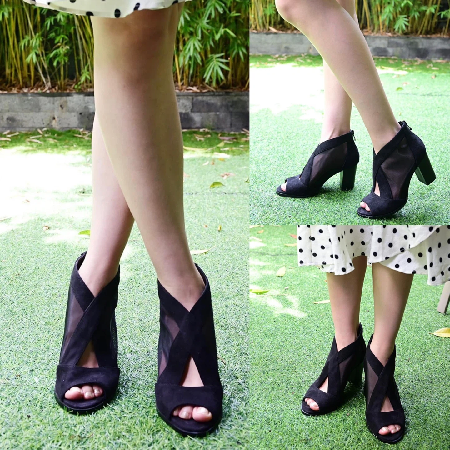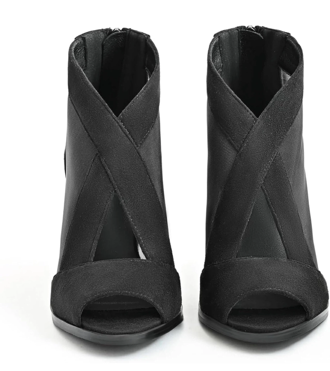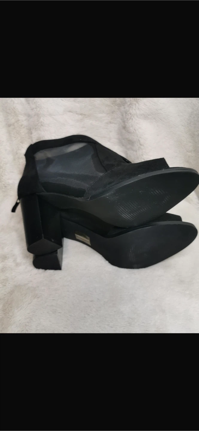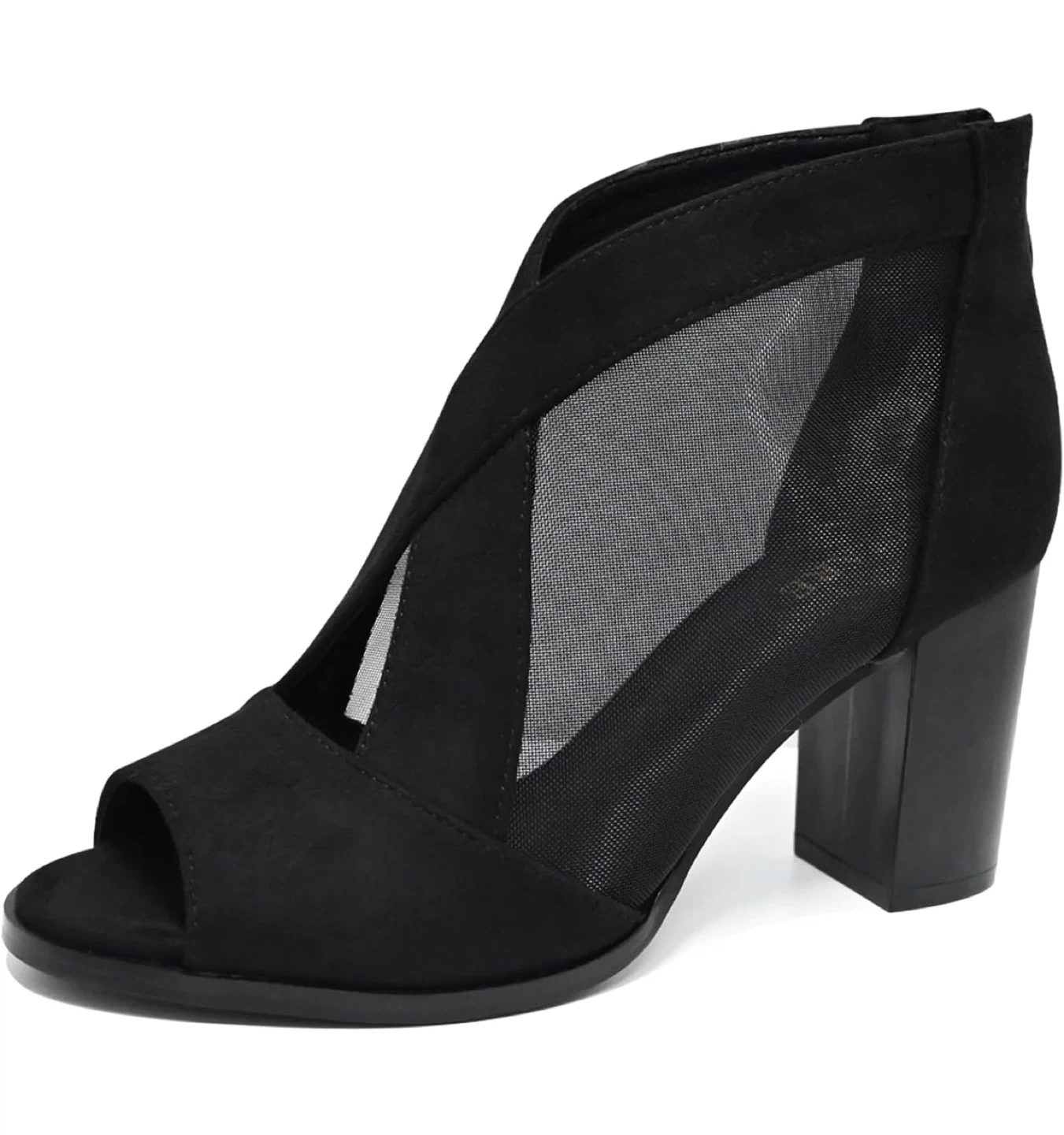 Stylish black booties with a chic peep-toe design. These feature a breathable mesh panel and a comfortable block heel. Zipper closure at the back for easy on and off.